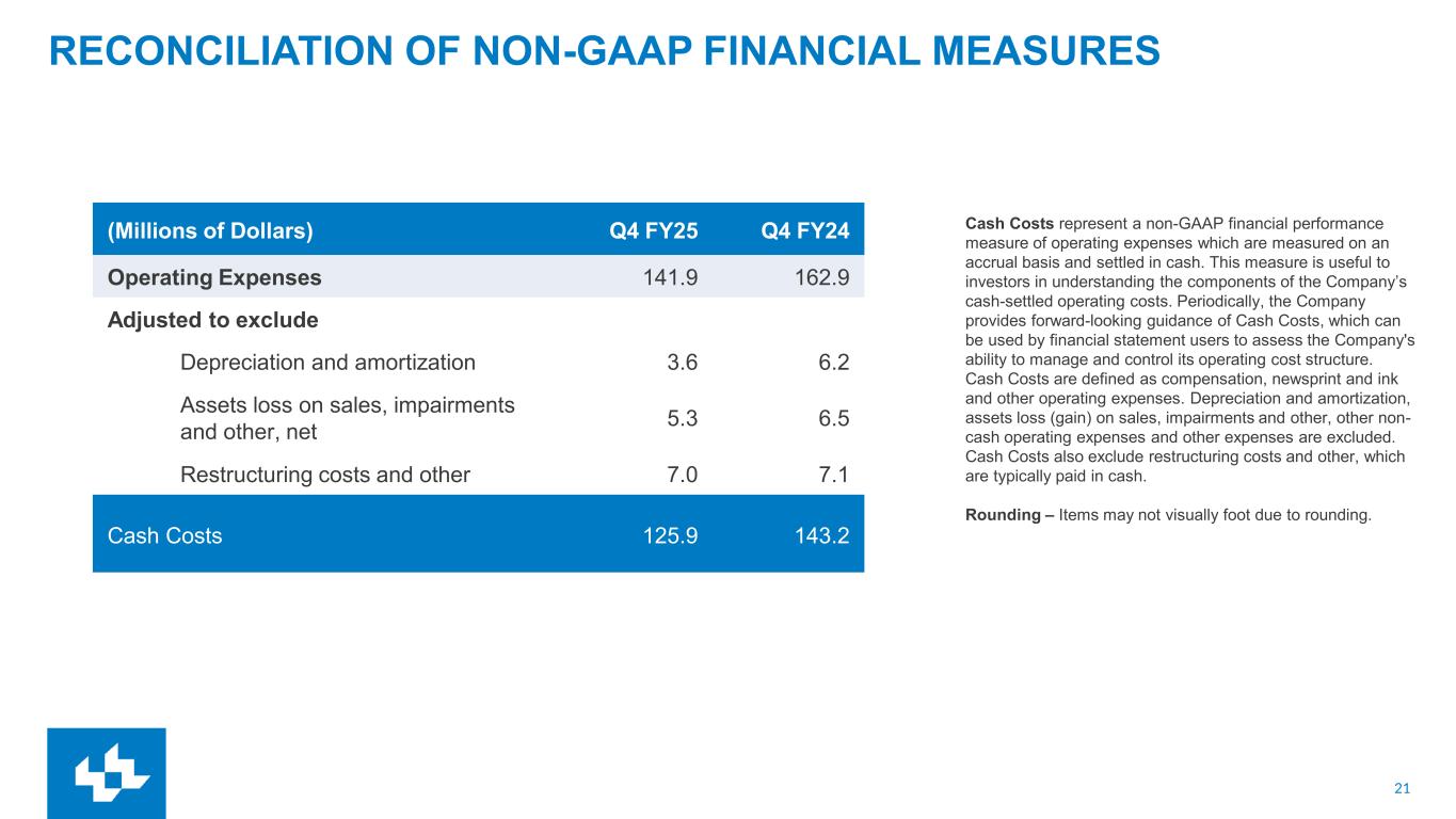 20 RECONCILIATION OF NON-GAAP FINANCIAL MEASURES Adjusted EBITDA is a non-GAAP financial performance measure that enhances financial statement users’ overall understanding of the operating performance of the Company. The measure isolates unusual, infrequent or non- cash transactions from the operating performance of the business. This allows users to easily compare operating performance among various fiscal periods and how management measures the performance of the business. This measure also provides users with a benchmark that can be used when forecasting future operating performance of the Company that excludes unusual, nonrecurring or one- time transactions. Adjusted EBITDA is a component of the calculation used by stockholders and analysts to determine the value of our business when using the market approach, which applies a market multiple to financial metrics. It is also a measure used to calculate the leverage ratio of the Company, which is a key financial ratio monitored and used by the Company and its investors. Adjusted EBITDA is defined as net income (loss), plus non-operating expenses, income tax expense, depreciation and amortization, assets loss (gain) on sales, impairments and other, restructuring costs and other, stock compensation and our 50% share of EBITDA from TNI and MNI, minus equity in earnings of TNI and MNI. Comparable basis is a non-GAAP performance measure based on U.S. GAAP trends for Lee for the current period, excluding the extra week in the prior year. TNI and MNI – TNI refers to TNI Partners publishing operations in Tucson, AZ. MNI refers to Madison Newspapers, Inc. publishing operations in Madison, WI. Rounding – Items may not visually foot due to rounding. (Millions of Dollars) FY2025 FY2024 Net loss (35.7) (23.6) Adjusted to exclude Income tax benefit (6.9) (7.6) Non-operating expenses, net 38.0 35.7 Equity in earnings of TNI and MNI (4.3) (4.6) Depreciation and amortization 18.8 27.6 Restructuring costs and other 25.9 19.3 Assets loss on sales, impairments and other, net 3.0 11.2 Stock compensation 1.8 1.7 Add Ownership share of TNI and MNI EBITDA (50%) 4.9 5.5 Adjusted EBITDA 45.4 65.3 Adjusted EBITDA associated with the 53rd week -- 3.6 Comparable Adjusted EBITDA 45.4 61.7