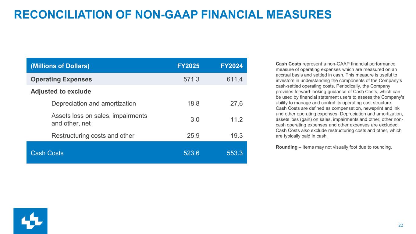 21 RECONCILIATION OF NON-GAAP FINANCIAL MEASURES Cash Costs represent a non-GAAP financial performance measure of operating expenses which are measured on an accrual basis and settled in cash. This measure is useful to investors in understanding the components of the Company’s cash-settled operating costs. Periodically, the Company provides forward-looking guidance of Cash Costs, which can be used by financial statement users to assess the Company's ability to manage and control its operating cost structure. Cash Costs are defined as compensation, newsprint and ink and other operating expenses. Depreciation and amortization, assets loss (gain) on sales, impairments and other, other non- cash operating expenses and other expenses are excluded. Cash Costs also exclude restructuring costs and other, which are typically paid in cash. Rounding – Items may not visually foot due to rounding. (Millions of Dollars) Q4 FY25 Q4 FY24 Operating Expenses 141.9 162.9 Adjusted to exclude Depreciation and amortization 3.6 6.2 Assets loss on sales, impairments and other, net 5.3 6.5 Restructuring costs and other 7.0 7.1 Cash Costs 125.9 143.2