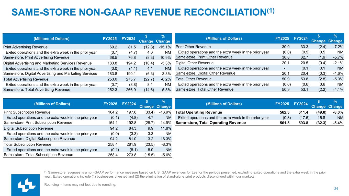 23 SAME-STORE NON-GAAP REVENUE RECONCILIATION(1) (1) Same-store revenues is a non-GAAP performance measure based on U.S. GAAP revenues for Lee for the periods presented, excluding exited operations and the extra week in the prior year. Exited operations include (1) businesses divested and (2) the elimination of stand-alone print products discontinued within our markets. Rounding – Items may not foot due to rounding. (Millions of Dollars) Q4 FY2025 Q4 FY2024 $ Change % Change Print Advertising Revenue 15.3 19.4 (4.1) -21.0% Exited operations and the extra week in the prior year (0.1) (2.2) 2.1 NM Same-store, Print Advertising Revenue 15.2 17.2 (2.0) -11.5% Digital Advertising and Marketing Services Revenue 44.1 52.5 (8.4) -16.0% Exited operations and the extra week in the prior year (0.0) (3.0) 3.0 NM Same-store, Digital Advertising and Marketing Services 44.1 49.5 (5.4) -11.0% Total Advertising Revenue 59.4 71.8 (12.5) -17.4% Exited operations and the extra week in the prior year (0.1) (5.2) 5.1 NM Same-store, Total Advertising Revenue 59.3 66.7 (7.4) -11.1% (Millions of Dollars) Q4 FY2025 Q4 FY2024 $ Change % Change Print Subscription Revenue 41.6 49.1 (7.6) -15.4% Exited operations and the extra week in the prior year (0.0) (3.7) 3.7 NM Same-store, Print Subscription Revenue 41.6 45.4 (3.8) -8.4% Digital Subscription Revenue 25.4 23.9 1.5 6.3% Exited operations and the extra week in the prior year 0.0 (2.1) 2.1 NM Same-store, Digital Subscription Revenue 25.4 21.8 3.6 16.4% Total Subscription Revenue 67.0 73.0 (6.1) -8.3% Exited operations and the extra week in the prior year (0.0) (5.8) 5.8 NM Same-store, Total Subscription Revenue 67.0 67.2 (0.2) -0.4% (Millions of Dollars) Q4 FY2025 Q4 FY2024 $ Change % Change Print Other Revenue 7.9 8.4 (0.5) -5.9% Exited operations and the extra week in the prior year (0.0) (0.5) 0.5 NM Same-store, Print Other Revenue 7.9 7.9 (0.0) -0.1% Digital Other Revenue 4.8 5.3 (0.4) -8.4% Exited operations and the extra week in the prior year - (0.1) 0.1 NM Same-store, Digital Other Revenue 4.8 5.2 (0.3) -6.5% Total Other Revenue 12.8 13.7 (0.9) -6.8% Exited operations and the extra week in the prior year (0.0) (0.6) 0.6 NM Same-store, Total Other Revenue 12.7 13.1 (0.3) -2.6% (Millions of Dollars) Q4 FY2025 Q4 FY2024 $ Change % Change Total Operating Revenue 139.1 158.6 (19.5) -12.3% Exited operations and the extra week in the prior year (0.1) (11.6) 11.5 NM Same-store, Total Operating Revenue 139.0 147.0 (8.0) -5.4%