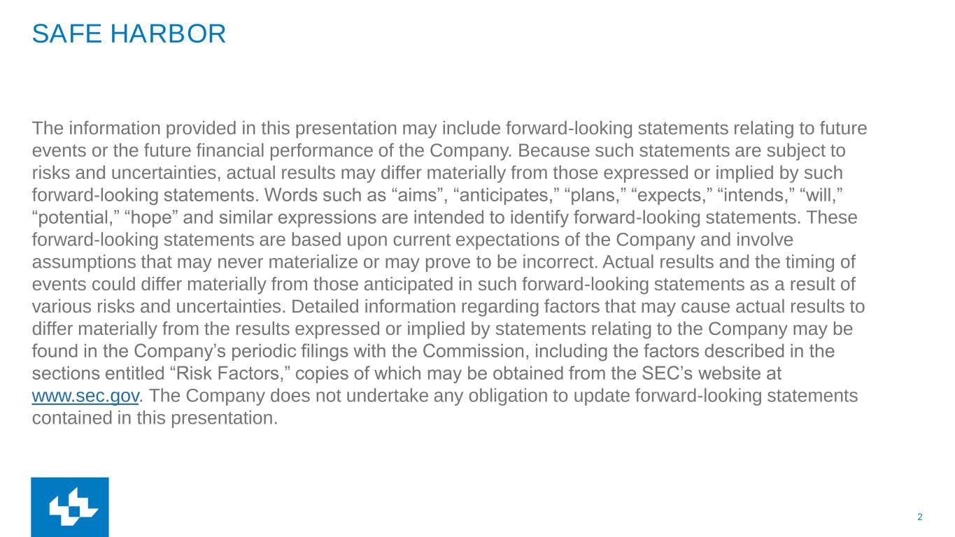2 SAFE HARBOR The information provided in this presentation may include forward-looking statements relating to future events or the future financial performance of the Company. Because such statements are subject to risks and uncertainties, actual results may differ materially from those expressed or implied by such forward-looking statements. Words such as “aims”, “anticipates,” “plans,” “expects,” “intends,” “will,” “potential,” “hope” and similar expressions are intended to identify forward-looking statements. These forward-looking statements are based upon current expectations of the Company and involve assumptions that may never materialize or may prove to be incorrect. Actual results and the timing of events could differ materially from those anticipated in such forward-looking statements as a result of various risks and uncertainties. Detailed information regarding factors that may cause actual results to differ materially from the results expressed or implied by statements relating to the Company may be found in the Company’s periodic filings with the Commission, including the factors described in the sections entitled “Risk Factors,” copies of which may be obtained from the SEC’s website at www.sec.gov. The Company does not undertake any obligation to update forward-looking statements contained in this presentation.