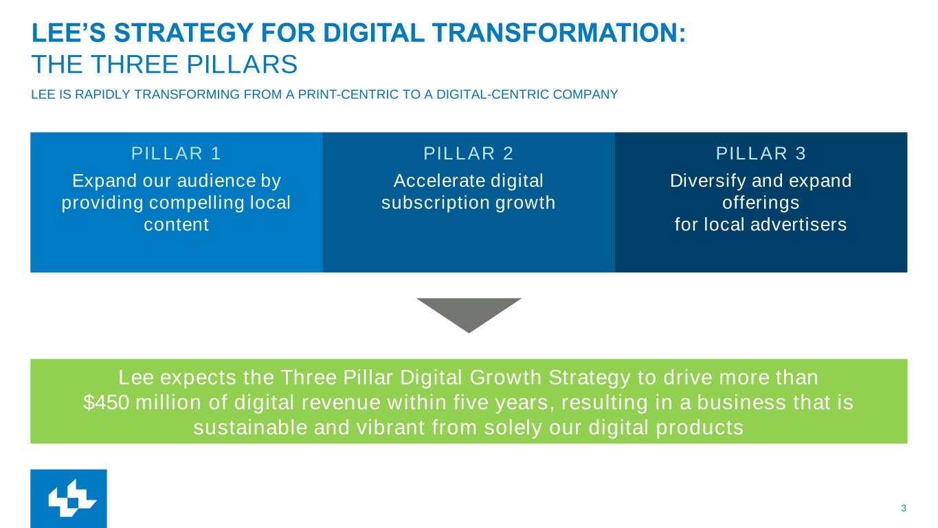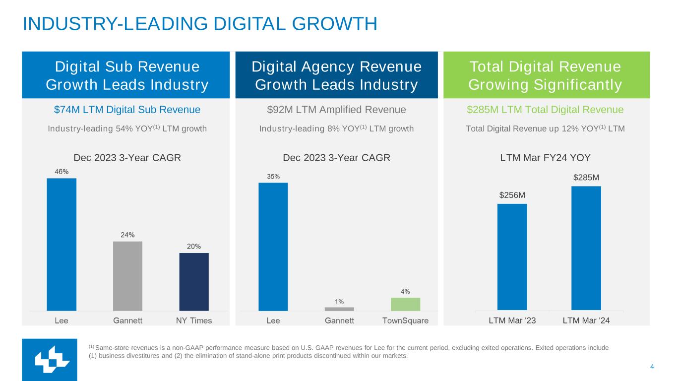 3 LEE’S STRATEGY FOR DIGITAL TRANSFORMATION: THE THREE PILLARS LEE IS RAPIDLY TRANSFORMING FROM A PRINT-CENTRIC TO A DIGITAL-CENTRIC COMPANY PILLAR 1 Expand our audience by providing compelling local content PILLAR 2 Accelerate digital subscription growth PILLAR 3 Diversify and expand offerings for local advertisers Lee expects the Three Pillar Digital Growth Strategy to drive more than $450 million of digital revenue within five years, resulting in a business that is sustainable and vibrant from solely our digital products