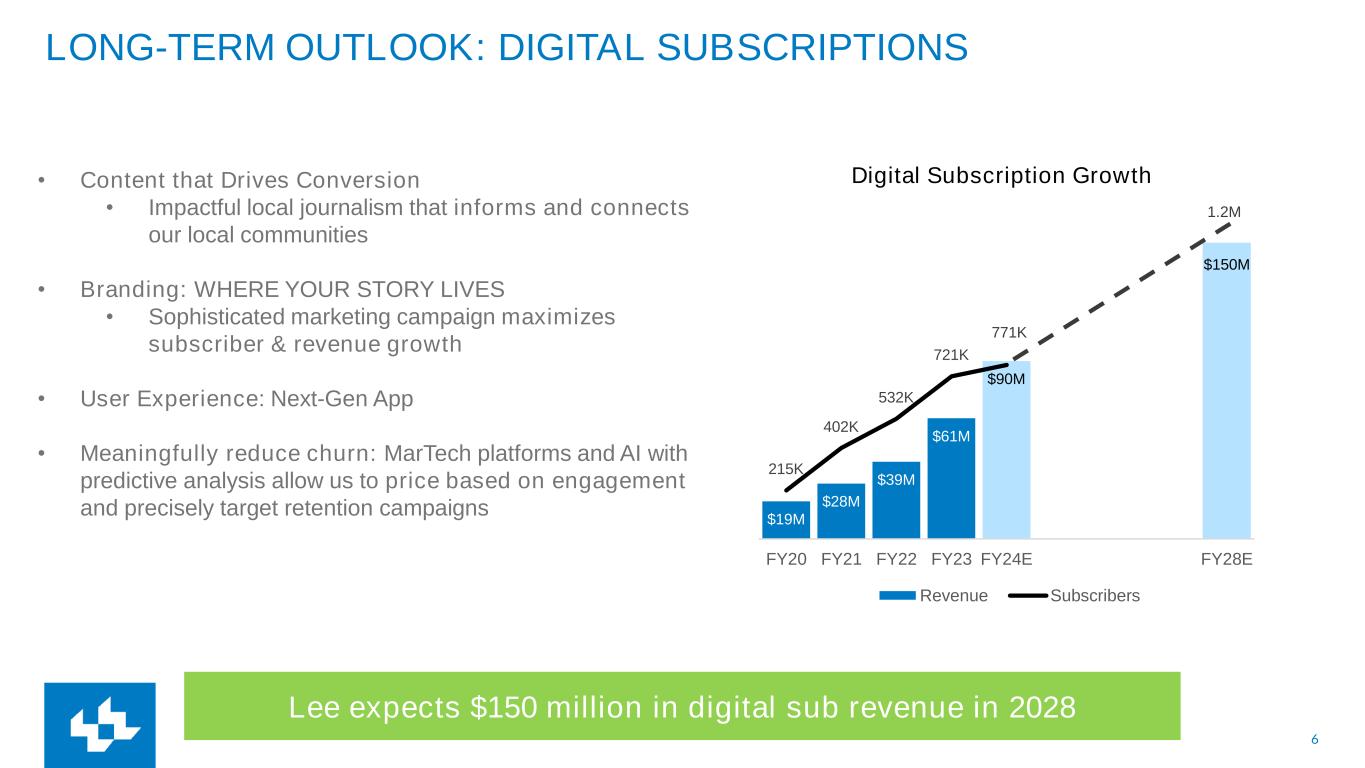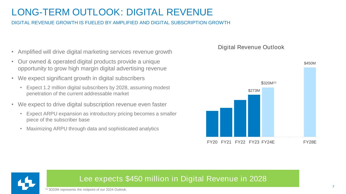6 $19M $28M $39M $61M $90M $150M 215K 402K 532K 721K FY20 FY21 FY22 FY23 FY24E FY28E Digital Subscription Growth Revenue Subscribers LONG-TERM OUTLOOK: DIGITAL SUBSCRIPTIONS Lee expects $150 million in digital sub revenue in 2028 • Content that Drives Conversion • Impactful local journalism that informs and connects our local communities • Branding: WHERE YOUR STORY LIVES • Sophisticated marketing campaign maximizes subscriber & revenue growth • User Experience: Next-Gen App • Meaningfully reduce churn: MarTech platforms and AI with predictive analysis allow us to price based on engagement and precisely target retention campaigns 1.2M 771K