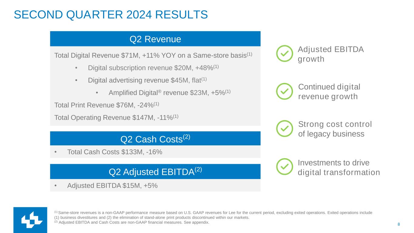 7 DIGITAL REVENUE GROWTH IS FUELED BY AMPLIFIED AND DIGITAL SUBSCRIPTION GROWTH • Amplified will drive digital marketing services revenue growth • Our owned & operated digital products provide a unique opportunity to grow high margin digital advertising revenue • We expect significant growth in digital subscribers • Expect 1.2 million digital subscribers by 2028, assuming modest penetration of the current addressable market • We expect to drive digital subscription revenue even faster • Expect ARPU expansion as introductory pricing becomes a smaller piece of the subscriber base • Maximizing ARPU through data and sophisticated analytics $273M $450M $M $100M $200M $300M $400M $500M FY20 FY21 FY22 FY23 FY24E FY28E Digital Revenue Outlook LONG-TERM OUTLOOK: DIGITAL REVENUE Lee expects $450 million in Digital Revenue in 2028 (1) $320M represents the midpoint of our 2024 Outlook. $320M(1)