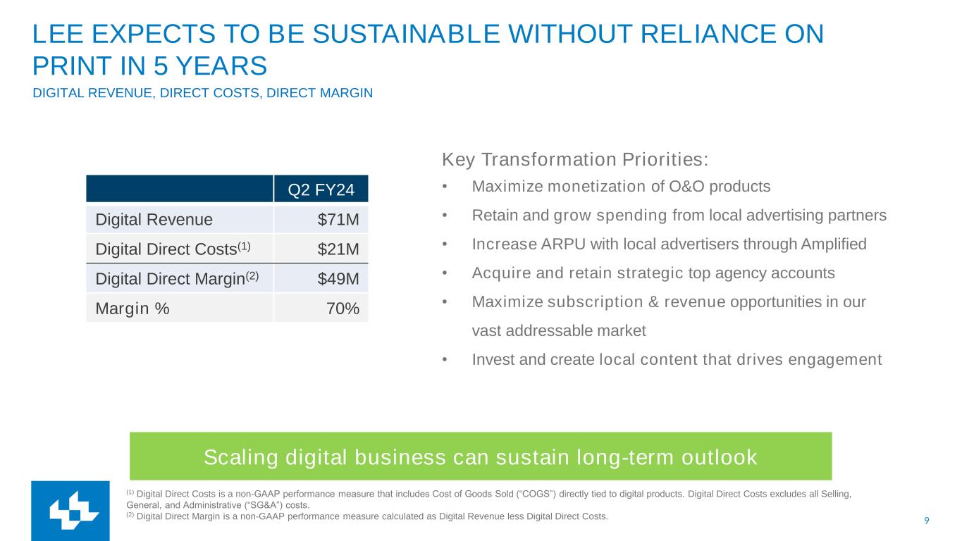 8 SECOND QUARTER 2024 RESULTS Q2 Revenue (1) Same-store revenues is a non-GAAP performance measure based on U.S. GAAP revenues for Lee for the current period, excluding exited operations. Exited operations include (1) business divestitures and (2) the elimination of stand-alone print products discontinued within our markets. (2) Adjusted EBITDA and Cash Costs are non-GAAP financial measures. See appendix. Total Digital Revenue $71M, +11% YOY on a Same-store basis(1) • Digital subscription revenue $20M, +48%(1) • Digital advertising revenue $45M, flat(1) • Amplified Digital® revenue $23M, +5%(1) Total Print Revenue $76M, -24%(1) Total Operating Revenue $147M, -11%(1) Q2 Cash Costs(2) • Total Cash Costs $133M, -16% Q2 Adjusted EBITDA(2) • Adjusted EBITDA $15M, +5% Continued digital revenue growth Strong cost control of legacy business Investments to drive digital transformation Adjusted EBITDA growth