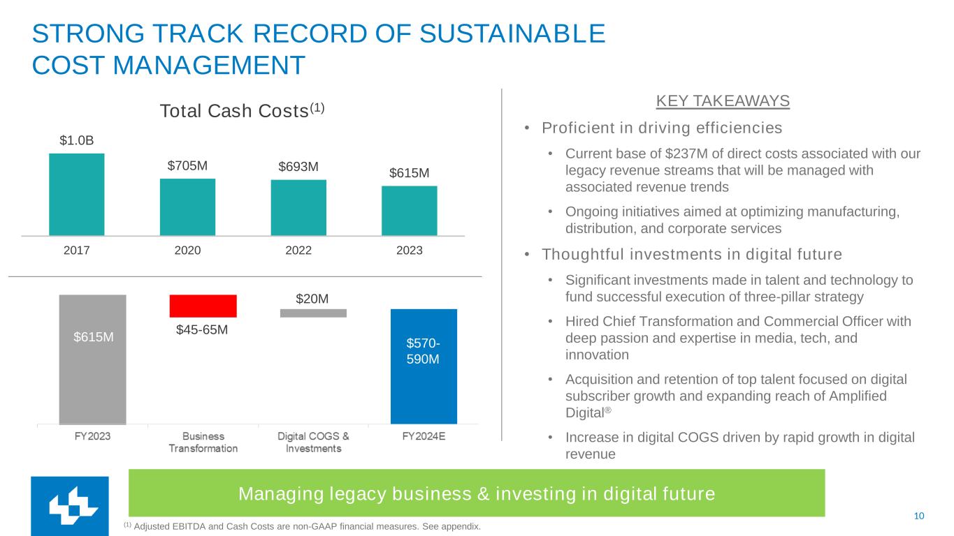 9 LEE EXPECTS TO BE SUSTAINABLE WITHOUT RELIANCE ON PRINT IN 5 YEARS Scaling digital business can sustain long-term outlook Key Transformation Priorities: • Maximize monetization of O&O products • Retain and grow spending from local advertising partners • Increase ARPU with local advertisers through Amplified • Acquire and retain strategic top agency accounts • Maximize subscription & revenue opportunities in our vast addressable market • Invest and create local content that drives engagement Q2 FY24 Digital Revenue $71M Digital Direct Costs(1) $21M Digital Direct Margin(2) $49M Margin % 70% (1) Digital Direct Costs is a non-GAAP performance measure that includes Cost of Goods Sold (“COGS”) directly tied to digital products. Digital Direct Costs excludes all Selling, General, and Administrative (“SG&A”) costs. (2) Digital Direct Margin is a non-GAAP performance measure calculated as Digital Revenue less Digital Direct Costs. DIGITAL REVENUE, DIRECT COSTS, DIRECT MARGIN