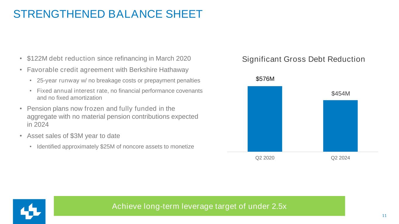 11 Q2 2020 Q2 2024 STRENGTHENED BALANCE SHEET • $122M debt reduction since refinancing in March 2020 • Favorable credit agreement with Berkshire Hathaway • 25-year runway w/ no breakage costs or prepayment penalties • Fixed annual interest rate, no financial performance covenants and no fixed amortization • Pension plans now frozen and fully funded in the aggregate with no material pension contributions expected in 2024 • Asset sales of $3M year to date • Identified approximately $25M of noncore assets to monetize Achieve long-term leverage target of under 2.5x $576M $454M Significant Gross Debt Reduction