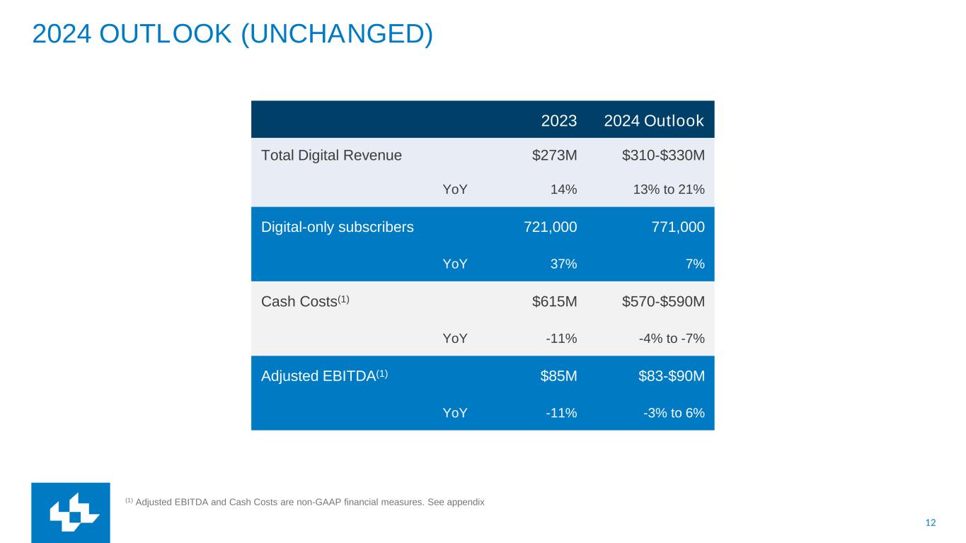 12 2024 OUTLOOK (UNCHANGED) 2023 2024 Outlook Total Digital Revenue $273M $310-$330M YoY 14% 13% to 21% Digital-only subscribers 721,000 771,000 YoY 37% 7% Cash Costs(1) $615M $570-$590M YoY -11% -4% to -7% Adjusted EBITDA(1) $85M $83-$90M YoY -11% -3% to 6% (1) Adjusted EBITDA and Cash Costs are non-GAAP financial measures. See appendix