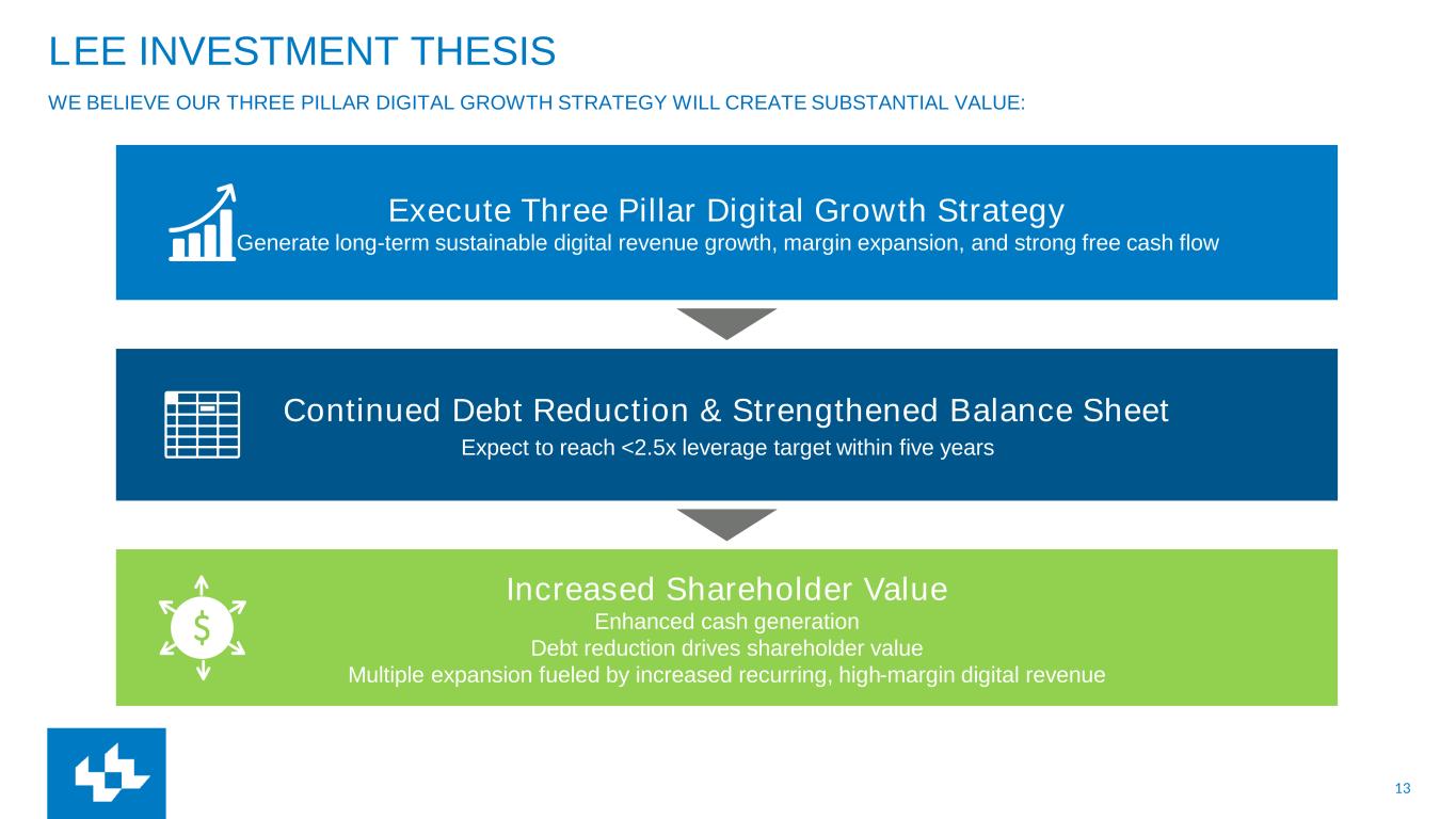 13 LEE INVESTMENT THESIS WE BELIEVE OUR THREE PILLAR DIGITAL GROWTH STRATEGY WILL CREATE SUBSTANTIAL VALUE: Increased Shareholder Value Enhanced cash generation Debt reduction drives shareholder value Multiple expansion fueled by increased recurring, high-margin digital revenue Continued Debt Reduction & Strengthened Balance Sheet Expect to reach <2.5x leverage target within five years Execute Three Pillar Digital Growth Strategy Generate long-term sustainable digital revenue growth, margin expansion, and strong free cash flow