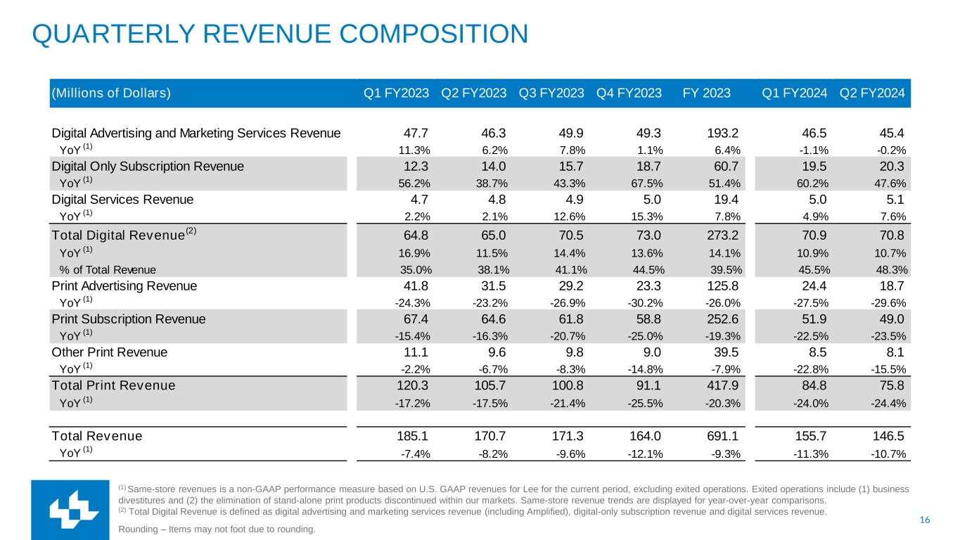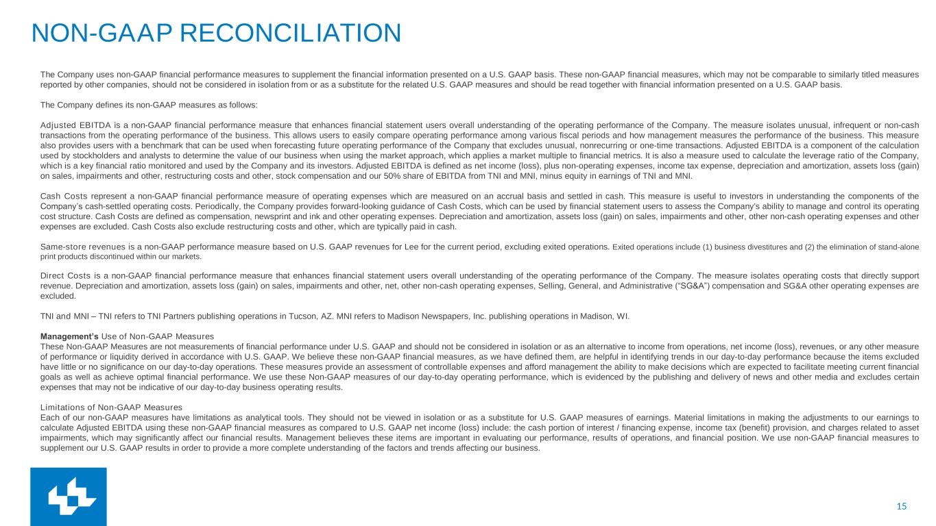 15 NON-GAAP RECONCILIATION The Company uses non-GAAP financial performance measures to supplement the financial information presented on a U.S. GAAP basis. These non-GAAP financial measures, which may not be comparable to similarly titled measures reported by other companies, should not be considered in isolation from or as a substitute for the related U.S. GAAP measures and should be read together with financial information presented on a U.S. GAAP basis. The Company defines its non-GAAP measures as follows: Adjusted EBITDA is a non-GAAP financial performance measure that enhances financial statement users overall understanding of the operating performance of the Company. The measure isolates unusual, infrequent or non-cash transactions from the operating performance of the business. This allows users to easily compare operating performance among various fiscal periods and how management measures the performance of the business. This measure also provides users with a benchmark that can be used when forecasting future operating performance of the Company that excludes unusual, nonrecurring or one-time transactions. Adjusted EBITDA is a component of the calculation used by stockholders and analysts to determine the value of our business when using the market approach, which applies a market multiple to financial metrics. It is also a measure used to calculate the leverage ratio of the Company, which is a key financial ratio monitored and used by the Company and its investors. Adjusted EBITDA is defined as net income (loss), plus non-operating expenses, income tax expense, depreciation and amortization, assets loss (gain) on sales, impairments and other, restructuring costs and other, stock compensation and our 50% share of EBITDA from TNI and MNI, minus equity in earnings of TNI and MNI. Cash Costs represent a non-GAAP financial performance measure of operating expenses which are measured on an accrual basis and settled in cash. This measure is useful to investors in understanding the components of the Company’s cash-settled operating costs. Periodically, the Company provides forward-looking guidance of Cash Costs, which can be used by financial statement users to assess the Company's ability to manage and control its operating cost structure. Cash Costs are defined as compensation, newsprint and ink and other operating expenses. Depreciation and amortization, assets loss (gain) on sales, impairments and other, other non-cash operating expenses and other expenses are excluded. Cash Costs also exclude restructuring costs and other, which are typically paid in cash. Same-store revenues is a non-GAAP performance measure based on U.S. GAAP revenues for Lee for the current period, excluding exited operations. Exited operations include (1) business divestitures and (2) the elimination of stand-alone print products discontinued within our markets. Direct Costs is a non-GAAP financial performance measure that enhances financial statement users overall understanding of the operating performance of the Company. The measure isolates operating costs that directly support revenue. Depreciation and amortization, assets loss (gain) on sales, impairments and other, net, other non-cash operating expenses, Selling, General, and Administrative (“SG&A”) compensation and SG&A other operating expenses are excluded. TNI and MNI – TNI refers to TNI Partners publishing operations in Tucson, AZ. MNI refers to Madison Newspapers, Inc. publishing operations in Madison, WI. Management’s Use of Non-GAAP Measures These Non-GAAP Measures are not measurements of financial performance under U.S. GAAP and should not be considered in isolation or as an alternative to income from operations, net income (loss), revenues, or any other measure of performance or liquidity derived in accordance with U.S. GAAP. We believe these non-GAAP financial measures, as we have defined them, are helpful in identifying trends in our day-to-day performance because the items excluded have little or no significance on our day-to-day operations. These measures provide an assessment of controllable expenses and afford management the ability to make decisions which are expected to facilitate meeting current financial goals as well as achieve optimal financial performance. We use these Non-GAAP measures of our day-to-day operating performance, which is evidenced by the publishing and delivery of news and other media and excludes certain expenses that may not be indicative of our day-to-day business operating results. Limitations of Non-GAAP Measures Each of our non-GAAP measures have limitations as analytical tools. They should not be viewed in isolation or as a substitute for U.S. GAAP measures of earnings. Material limitations in making the adjustments to our earnings to calculate Adjusted EBITDA using these non-GAAP financial measures as compared to U.S. GAAP net income (loss) include: the cash portion of interest / financing expense, income tax (benefit) provision, and charges related to asset impairments, which may significantly affect our financial results. Management believes these items are important in evaluating our performance, results of operations, and financial position. We use non-GAAP financial measures to supplement our U.S. GAAP results in order to provide a more complete understanding of the factors and trends affecting our business.