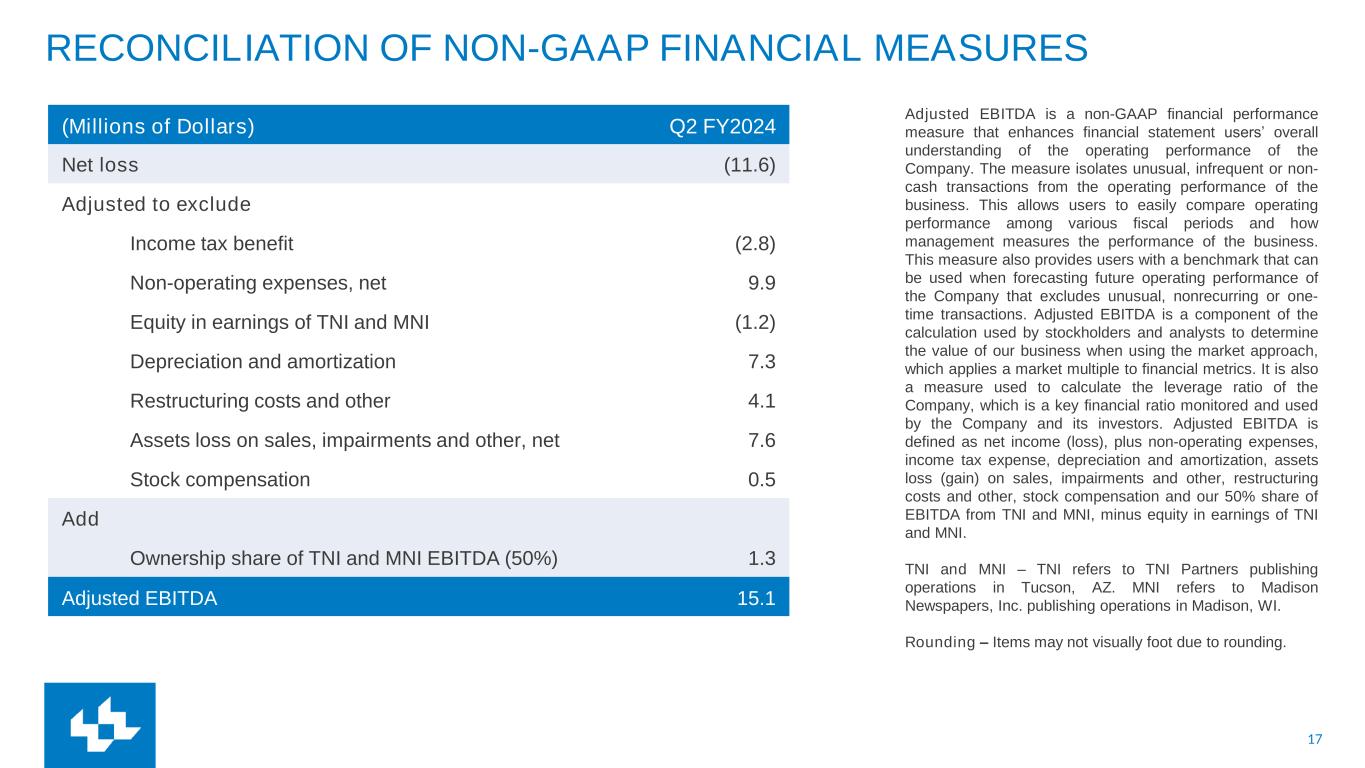 17 RECONCILIATION OF NON-GAAP FINANCIAL MEASURES Adjusted EBITDA is a non-GAAP financial performance measure that enhances financial statement users’ overall understanding of the operating performance of the Company. The measure isolates unusual, infrequent or non- cash transactions from the operating performance of the business. This allows users to easily compare operating performance among various fiscal periods and how management measures the performance of the business. This measure also provides users with a benchmark that can be used when forecasting future operating performance of the Company that excludes unusual, nonrecurring or one- time transactions. Adjusted EBITDA is a component of the calculation used by stockholders and analysts to determine the value of our business when using the market approach, which applies a market multiple to financial metrics. It is also a measure used to calculate the leverage ratio of the Company, which is a key financial ratio monitored and used by the Company and its investors. Adjusted EBITDA is defined as net income (loss), plus non-operating expenses, income tax expense, depreciation and amortization, assets loss (gain) on sales, impairments and other, restructuring costs and other, stock compensation and our 50% share of EBITDA from TNI and MNI, minus equity in earnings of TNI and MNI. TNI and MNI – TNI refers to TNI Partners publishing operations in Tucson, AZ. MNI refers to Madison Newspapers, Inc. publishing operations in Madison, WI. Rounding – Items may not visually foot due to rounding. (Millions of Dollars) Q2 FY2024 Net loss (11.6) Adjusted to exclude Income tax benefit (2.8) Non-operating expenses, net 9.9 Equity in earnings of TNI and MNI (1.2) Depreciation and amortization 7.3 Restructuring costs and other 4.1 Assets loss on sales, impairments and other, net 7.6 Stock compensation 0.5 Add Ownership share of TNI and MNI EBITDA (50%) 1.3 Adjusted EBITDA 15.1