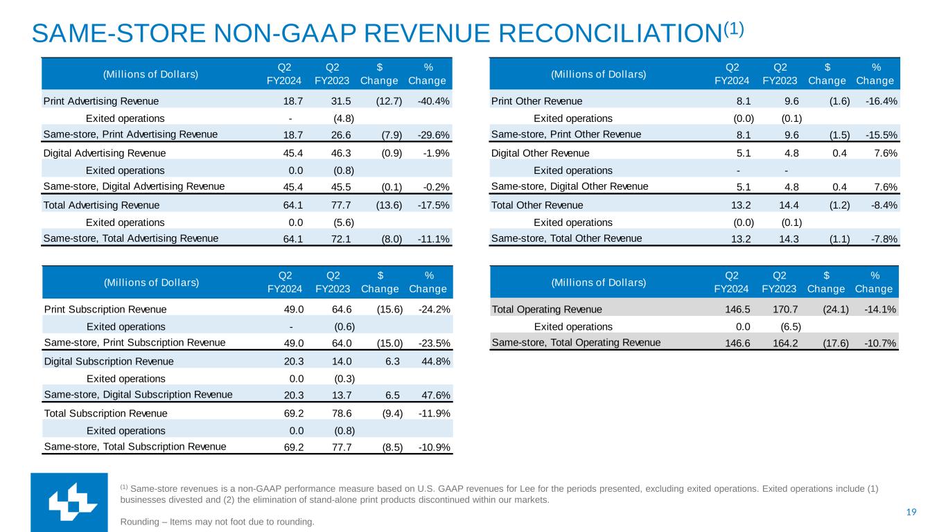 18 RECONCILIATION OF NON-GAAP FINANCIAL MEASURES Cash Costs represent a non-GAAP financial performance measure of operating expenses which are measured on an accrual basis and settled in cash. This measure is useful to investors in understanding the components of the Company’s cash-settled operating costs. Periodically, the Company provides forward-looking guidance of Cash Costs, which can be used by financial statement users to assess the Company's ability to manage and control its operating cost structure. Cash Costs are defined as compensation, newsprint and ink and other operating expenses. Depreciation and amortization, assets loss (gain) on sales, impairments and other, other non- cash operating expenses and other expenses are excluded. Cash Costs also exclude restructuring costs and other, which are typically paid in cash. Rounding – Items may not visually foot due to rounding. (Millions of Dollars) Q2 FY2024 Q2 FY2023 Operating Expenses 152.3 168.5 Adjusted to exclude Depreciation and amortization 7.3 7.7 Assets loss (gain) on sales, impairments and other, net 7.6 (0.8) Restructuring costs and other 4.1 3.7 Cash Costs 133.3 157.9
