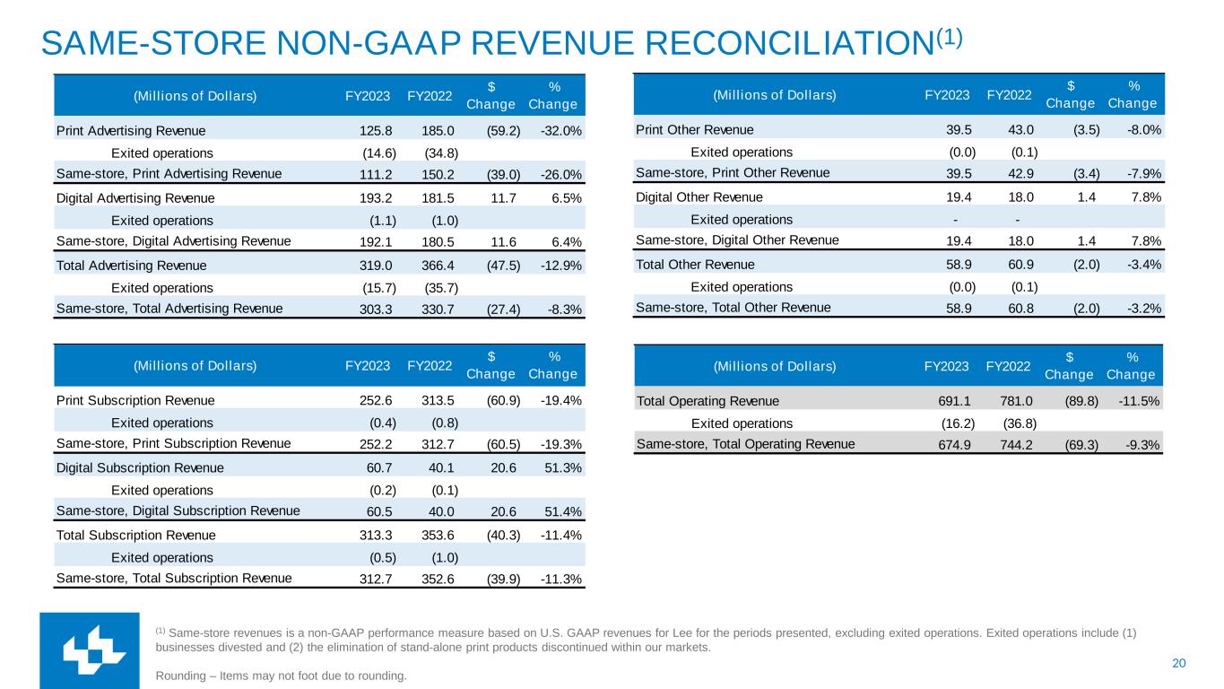 19 SAME-STORE NON-GAAP REVENUE RECONCILIATION(1) (1) Same-store revenues is a non-GAAP performance measure based on U.S. GAAP revenues for Lee for the periods presented, excluding exited operations. Exited operations include (1) businesses divested and (2) the elimination of stand-alone print products discontinued within our markets. Rounding – Items may not foot due to rounding. (Millions of Dollars) Q2 FY2024 Q2 FY2023 $ Change % Change Print Advertising Revenue 18.7 31.5 (12.7) -40.4% Exited operations - (4.8) Same-store, Print Advertising Revenue 18.7 26.6 (7.9) -29.6% Digital Advertising Revenue 45.4 46.3 (0.9) -1.9% Exited operations 0.0 (0.8) Same-store, Digital Advertising Revenue 45.4 45.5 (0.1) -0.2% Total Advertising Revenue 64.1 77.7 (13.6) -17.5% Exited operations 0.0 (5.6) Same-store, Total Advertising Revenue 64.1 72.1 (8.0) -11.1% (Millions of Dollars) Q2 FY2024 Q2 FY2023 $ Change % Change Print Subscription Revenue 49.0 64.6 (15.6) -24.2% Exited operations - (0.6) Same-store, Print Subscription Revenue 49.0 64.0 (15.0) -23.5% Digital Subscription Revenue 20.3 14.0 6.3 44.8% Exited operations 0.0 (0.3) Same-store, Digital Subscription Revenue 20.3 13.7 6.5 47.6% Total Subscription Revenue 69.2 78.6 (9.4) -11.9% Exited operations 0.0 (0.8) Same-store, Total Subscription Revenue 69.2 77.7 (8.5) -10.9% (Millions of Dollars) Q2 FY2024 Q2 FY2023 $ Change % Change Print Other Revenue 8.1 9.6 (1.6) -16.4% Exited operations (0.0) (0.1) Same-store, Print Other Revenue 8.1 9.6 (1.5) -15.5% Digital Other Revenue 5.1 4.8 0.4 7.6% Exited operations - - Same-store, Digital Other Revenue 5.1 4.8 0.4 7.6% Total Other Revenue 13.2 14.4 (1.2) -8.4% Exited operations (0.0) (0.1) Same-store, Total Other Revenue 13.2 14.3 (1.1) -7.8% (Millions of Dollars) Q2 FY2024 Q2 FY2023 $ Change % Change Total Operating Revenue 146.5 170.7 (24.1) -14.1% Exited operations 0.0 (6.5) Same-store, Total Operating Revenue 146.6 164.2 (17.6) -10.7%
