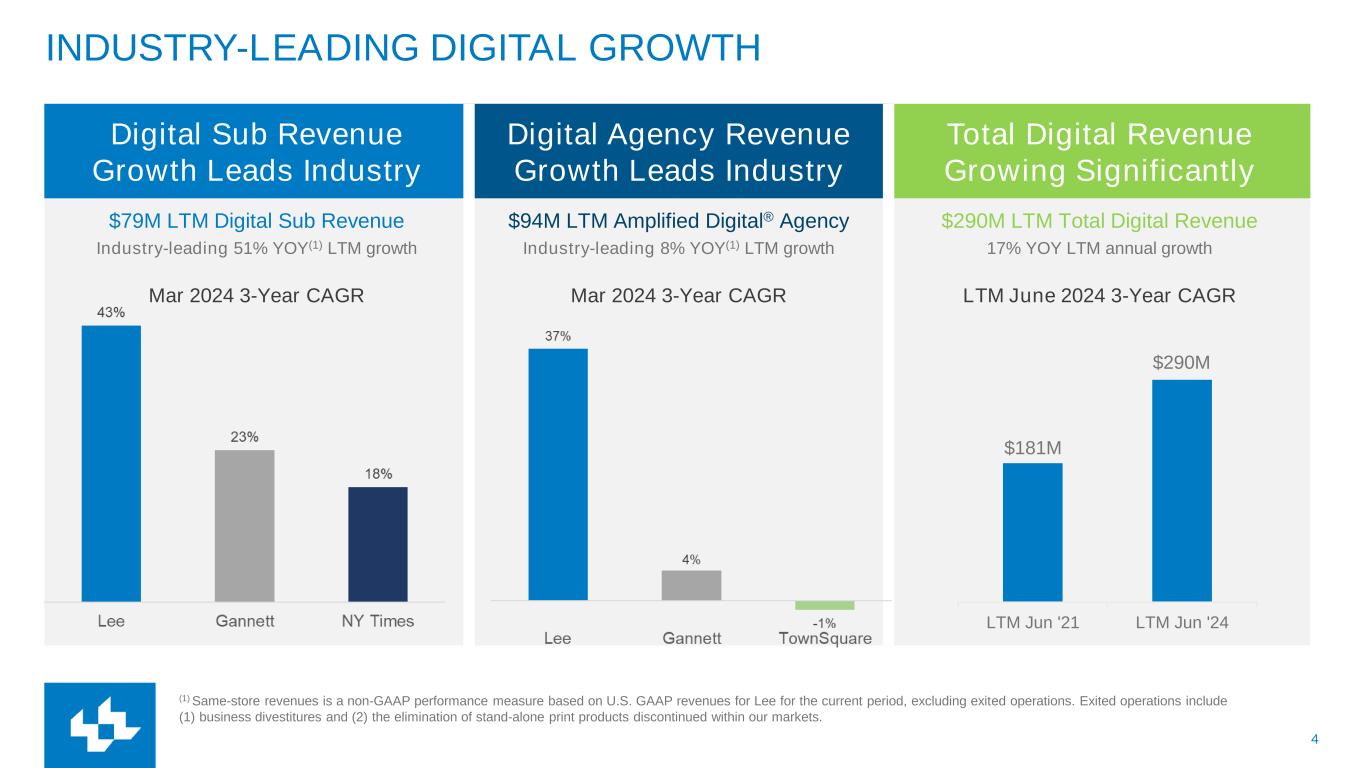 3 LEE’S THREE PILLAR DIGITAL GROWTH STRATEGY LEE IS RAPIDLY TRANSFORMING FROM A PRINT-CENTRIC TO A DIGITAL-CENTRIC COMPANY PILLAR 1 Expand our audience by providing compelling local content PILLAR 2 Accelerate digital subscription growth PILLAR 3 Diversify and expand offerings for local advertisers Lee expects the Three Pillar Digital Growth Strategy to drive more than $450 million of digital revenue by 2028, resulting in a business that is sustainable and vibrant from solely our digital products