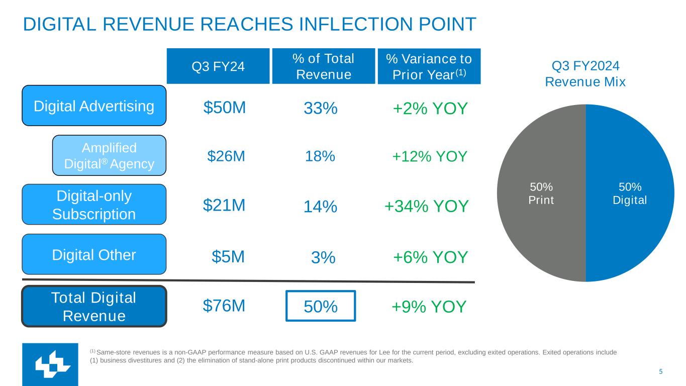4 Digital Sub Revenue Growth Leads Industry Digital Agency Revenue Growth Leads Industry Total Digital Revenue Growing Significantly $79M LTM Digital Sub Revenue $94M LTM Amplified Digital® Agency $290M LTM Total Digital Revenue Industry-leading 51% YOY(1) LTM growth Mar 2024 3-Year CAGR Industry-leading 8% YOY(1) LTM growth Mar 2024 3-Year CAGR 17% YOY LTM annual growth LTM June 2024 3-Year CAGR INDUSTRY-LEADING DIGITAL GROWTH LTM Jun '21 LTM Jun '24 (1) Same-store revenues is a non-GAAP performance measure based on U.S. GAAP revenues for Lee for the current period, excluding exited operations. Exited operations include (1) business divestitures and (2) the elimination of stand-alone print products discontinued within our markets. $290M $181M