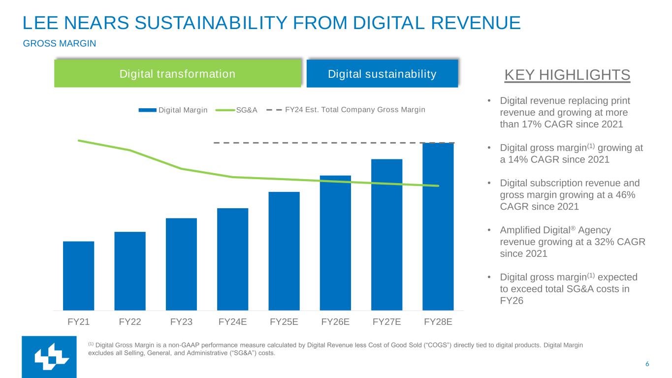 5 DIGITAL REVENUE REACHES INFLECTION POINT Digital Advertising Digital-only Subscription Digital Other Total Digital Revenue Q3 FY2024 Revenue Mix Q3 FY24 % of Total Revenue $50M % Variance to Prior Year(1) +2% YOY $21M +34% YOY $5M +6% YOY $76M +9% YOY (1) Same-store revenues is a non-GAAP performance measure based on U.S. GAAP revenues for Lee for the current period, excluding exited operations. Exited operations include (1) business divestitures and (2) the elimination of stand-alone print products discontinued within our markets. 3% 14% 33% Amplified Digital® Agency $26M +12% YOY18% 50% Digital 50% Print 50%
