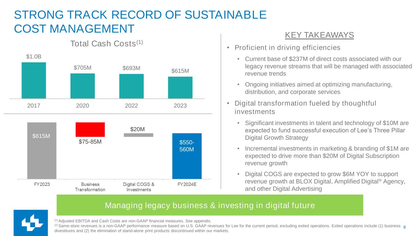 7 THIRD QUARTER 2024 RESULTS (1) Same-store revenues is a non-GAAP performance measure based on U.S. GAAP revenues for Lee for the current period, excluding exited operations. Exited operations include (1) business divestitures and (2) the elimination of stand-alone print products discontinued within our markets. (2) Adjusted EBITDA and Cash Costs are non-GAAP financial measures. See appendix. Continued digital revenue growth Strong cost control of legacy business Investments to drive digital transformation Q3 Revenue Total Digital Revenue $76M, +9% YOY on a Same-store basis(1) • Digital subscription revenue $21M, +34%(1) • Digital advertising revenue $50M, +2%(1) • Amplified Digital® Agency revenue $26M, +12%(1) Total Print Revenue $75M, -22%(1) Total Operating Revenue $151M, -9%(1) Q3 Cash Costs(2) • Total Cash Costs $138M, -8% Q3 Adjusted EBITDA(2) • Adjusted EBITDA $15M