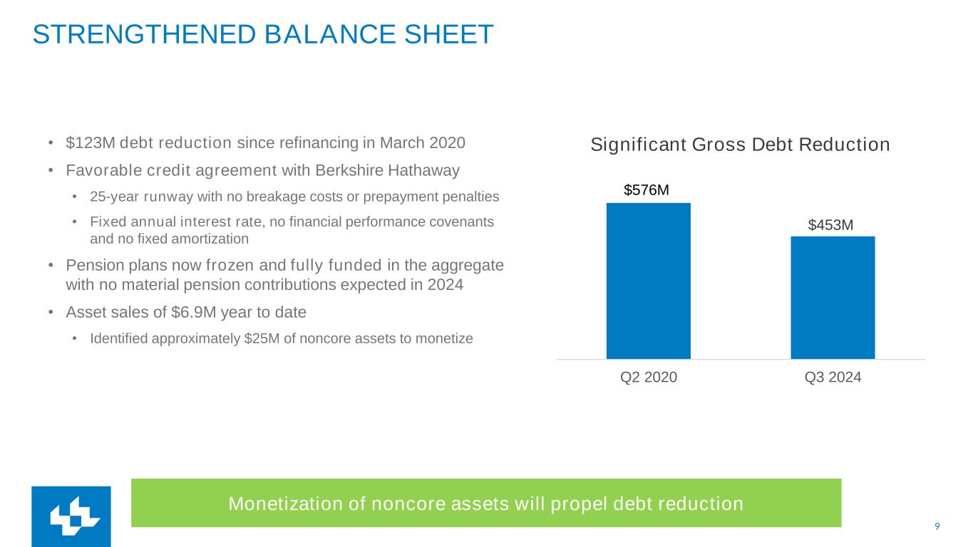 9 Q2 2020 Q3 2024 STRENGTHENED BALANCE SHEET • $123M debt reduction since refinancing in March 2020 • Favorable credit agreement with Berkshire Hathaway • 25-year runway with no breakage costs or prepayment penalties • Fixed annual interest rate, no financial performance covenants and no fixed amortization • Pension plans now frozen and fully funded in the aggregate with no material pension contributions expected in 2024 • Asset sales of $6.9M year to date • Identified approximately $25M of noncore assets to monetize Monetization of noncore assets will propel debt reduction $576M $453M Significant Gross Debt Reduction