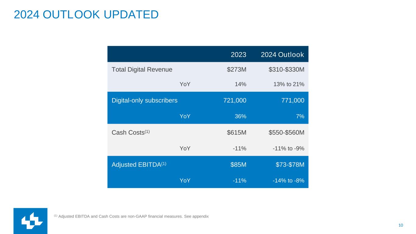 10 2024 OUTLOOK UPDATED 2023 2024 Outlook Total Digital Revenue $273M $310-$330M YoY 14% 13% to 21% Digital-only subscribers 721,000 771,000 YoY 36% 7% Cash Costs(1) $615M $550-$560M YoY -11% -11% to -9% Adjusted EBITDA(1) $85M $73-$78M YoY -11% -14% to -8% (1) Adjusted EBITDA and Cash Costs are non-GAAP financial measures. See appendix