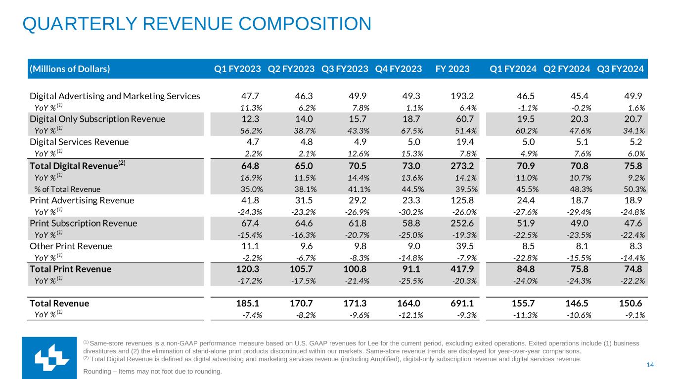 13 NON-GAAP RECONCILIATION The Company uses non-GAAP financial performance measures to supplement the financial information presented on a U.S. GAAP basis. These non-GAAP financial measures, which may not be comparable to similarly titled measures reported by other companies, should not be considered in isolation from or as a substitute for the related U.S. GAAP measures and should be read together with financial information presented on a U.S. GAAP basis. The Company defines its non-GAAP measures as follows: Adjusted EBITDA is a non-GAAP financial performance measure that enhances financial statement users overall understanding of the operating performance of the Company. The measure isolates unusual, infrequent or non-cash transactions from the operating performance of the business. This allows users to easily compare operating performance among various fiscal periods and how management measures the performance of the business. This measure also provides users with a benchmark that can be used when forecasting future operating performance of the Company that excludes unusual, nonrecurring or one-time transactions. Adjusted EBITDA is a component of the calculation used by stockholders and analysts to determine the value of our business when using the market approach, which applies a market multiple to financial metrics. It is also a measure used to calculate the leverage ratio of the Company, which is a key financial ratio monitored and used by the Company and its investors. Adjusted EBITDA is defined as net income (loss), plus non-operating expenses, income tax expense, depreciation and amortization, assets loss (gain) on sales, impairments and other, restructuring costs and other, stock compensation and our 50% share of EBITDA from TNI and MNI, minus equity in earnings of TNI and MNI. Cash Costs represent a non-GAAP financial performance measure of operating expenses which are measured on an accrual basis and settled in cash. This measure is useful to investors in understanding the components of the Company’s cash-settled operating costs. Periodically, the Company provides forward-looking guidance of Cash Costs, which can be used by financial statement users to assess the Company's ability to manage and control its operating cost structure. Cash Costs are defined as compensation, newsprint and ink and other operating expenses. Depreciation and amortization, assets loss (gain) on sales, impairments and other, other non-cash operating expenses and other expenses are excluded. Cash Costs also exclude restructuring costs and other, which are typically paid in cash. Same-store revenues is a non-GAAP performance measure based on U.S. GAAP revenues for Lee for the current period, excluding exited operations. Exited operations include (1) business divestitures and (2) the elimination of stand-alone print products discontinued within our markets. Gross Margin is a non-GAAP financial performance measure that enhances financial statement users overall understanding of the operating performance of the Company. The measure isolates operating costs that directly support revenue. Depreciation and amortization, assets loss (gain) on sales, impairments and other, net, other non-cash operating expenses, Selling, General, and Administrative (“SG&A”) compensation and SG&A other operating expenses are excluded from Gross Margin. TNI and MNI – TNI refers to TNI Partners publishing operations in Tucson, AZ. MNI refers to Madison Newspapers, Inc. publishing operations in Madison, WI. Management’s Use of Non-GAAP Measures These Non-GAAP Measures are not measurements of financial performance under U.S. GAAP and should not be considered in isolation or as an alternative to income from operations, net income (loss), revenues, or any other measure of performance or liquidity derived in accordance with U.S. GAAP. We believe these non-GAAP financial measures, as we have defined them, are helpful in identifying trends in our day-to-day performance because the items excluded have little or no significance on our day-to-day operations. These measures provide an assessment of controllable expenses and afford management the ability to make decisions which are expected to facilitate meeting current financial goals as well as achieve optimal financial performance. We use these Non-GAAP measures of our day-to-day operating performance, which is evidenced by the publishing and delivery of news and other media and excludes certain expenses that may not be indicative of our day-to-day business operating results. Limitations of Non-GAAP Measures Each of our non-GAAP measures have limitations as analytical tools. They should not be viewed in isolation or as a substitute for U.S. GAAP measures of earnings. Material limitations in making the adjustments to our earnings to calculate Adjusted EBITDA using these non-GAAP financial measures as compared to U.S. GAAP net income (loss) include: the cash portion of interest / financing expense, income tax (benefit) provision, and charges related to asset impairments, which may significantly affect our financial results. Management believes these items are important in evaluating our performance, results of operations, and financial position. We use non-GAAP financial measures to supplement our U.S. GAAP results in order to provide a more complete understanding of the factors and trends affecting our business.