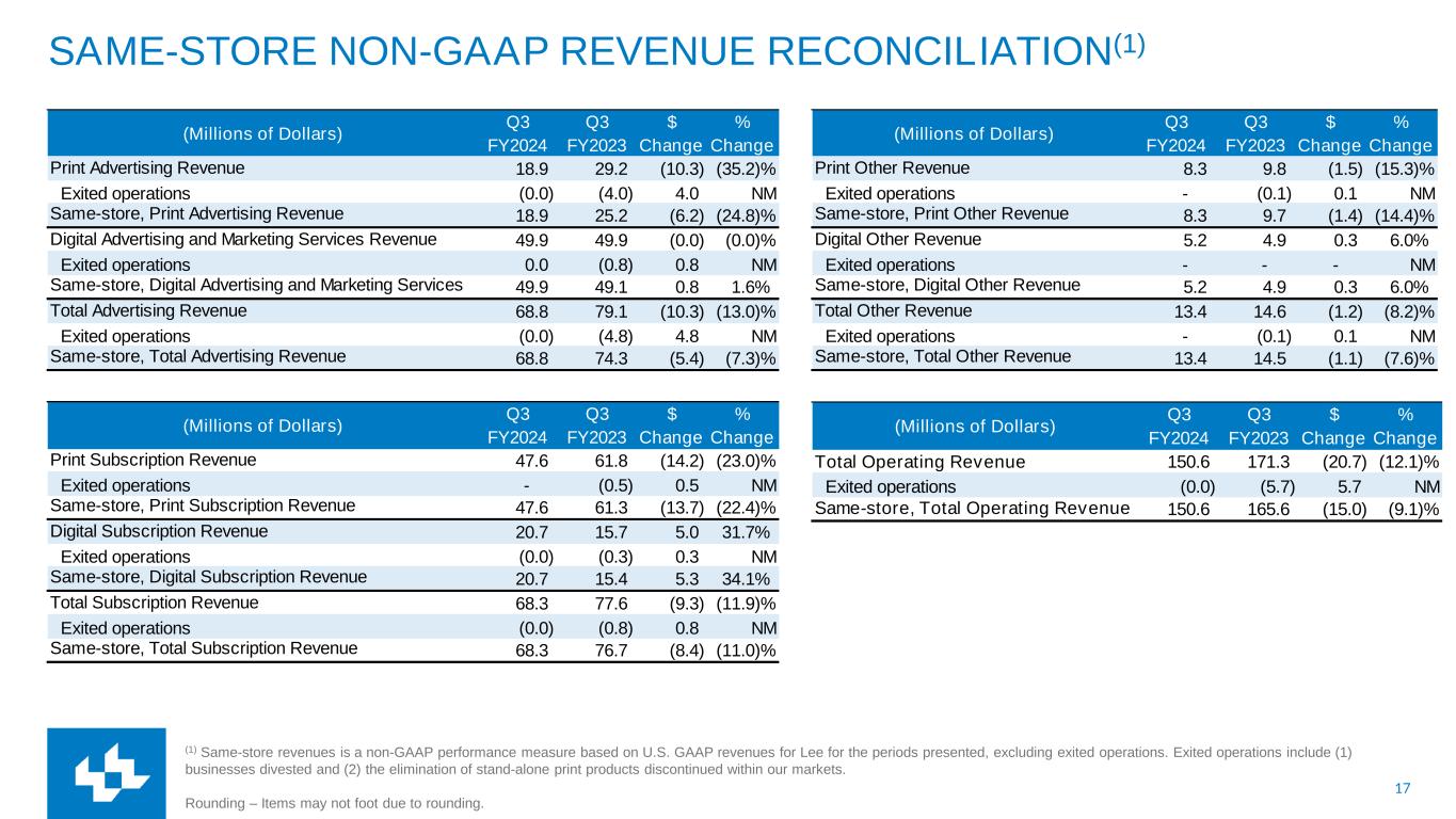 16 RECONCILIATION OF NON-GAAP FINANCIAL MEASURES Cash Costs represent a non-GAAP financial performance measure of operating expenses which are measured on an accrual basis and settled in cash. This measure is useful to investors in understanding the components of the Company’s cash-settled operating costs. Periodically, the Company provides forward-looking guidance of Cash Costs, which can be used by financial statement users to assess the Company's ability to manage and control its operating cost structure. Cash Costs are defined as compensation, newsprint and ink and other operating expenses. Depreciation and amortization, assets loss (gain) on sales, impairments and other, other non- cash operating expenses and other expenses are excluded. Cash Costs also exclude restructuring costs and other, which are typically paid in cash. Rounding – Items may not visually foot due to rounding. (Millions of Dollars) Q3 FY2024 Q3 FY2023 Operating Expenses 146.8 160.3 Adjusted to exclude Depreciation and amortization 6.9 7.5 Assets gain on sales, impairments and other, net (1.4) (0.9) Restructuring costs and other 3.8 3.8 Cash Costs 137.6 149.9