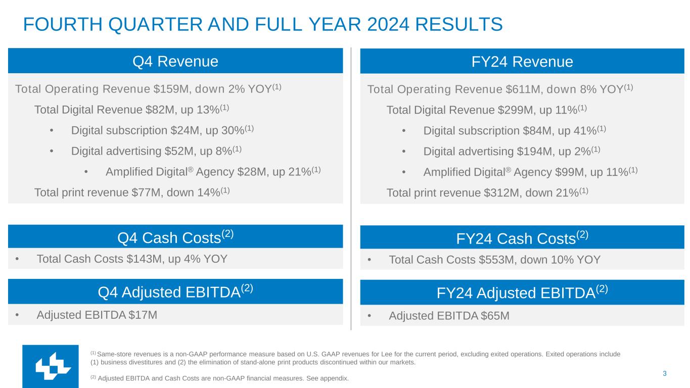 3 FOURTH QUARTER AND FULL YEAR 2024 RESULTS Q4 Revenue (1) Same-store revenues is a non-GAAP performance measure based on U.S. GAAP revenues for Lee for the current period, excluding exited operations. Exited operations include (1) business divestitures and (2) the elimination of stand-alone print products discontinued within our markets. (2) Adjusted EBITDA and Cash Costs are non-GAAP financial measures. See appendix. Total Operating Revenue $159M, down 2% YOY(1) Total Digital Revenue $82M, up 13%(1) • Digital subscription $24M, up 30%(1) • Digital advertising $52M, up 8%(1) • Amplified Digital® Agency $28M, up 21%(1) Total print revenue $77M, down 14%(1) Q4 Cash Costs(2) • Total Cash Costs $143M, up 4% YOY Q4 Adjusted EBITDA(2) • Adjusted EBITDA $17M FY24 Revenue Total Operating Revenue $611M, down 8% YOY(1) Total Digital Revenue $299M, up 11%(1) • Digital subscription $84M, up 41%(1) • Digital advertising $194M, up 2%(1) • Amplified Digital® Agency $99M, up 11%(1) Total print revenue $312M, down 21%(1) FY24 Cash Costs(2) • Total Cash Costs $553M, down 10% YOY FY24 Adjusted EBITDA(2) • Adjusted EBITDA $65M