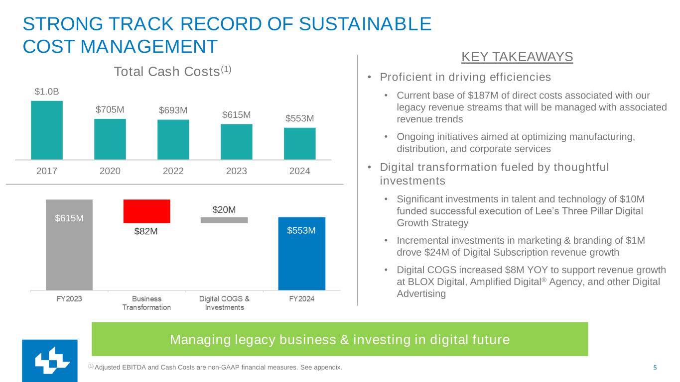 4 Digital Sub Revenue Growth Leads Industry Digital Agency Revenue Growth Leads Industry Total Digital Revenue Growing Significantly $84M LTM Digital Sub Revenue $99M LTM Amplified Digital® Agency $299M LTM Total Digital Revenue Industry-leading 41% YOY(1) LTM growth Q4 2024 3-Year CAGR Industry-leading 11% YOY(1) LTM growth Q4 2024 3-Year CAGR 11% YOY(1) LTM annual growth 2024 3-Year CAGR 17% INDUSTRY-LEADING DIGITAL GROWTH 2021 2024 (1) Same-store revenues is a non-GAAP performance measure based on U.S. GAAP revenues for Lee for the current period, excluding exited operations. Exited operations include (1) business divestitures and (2) the elimination of stand-alone print products discontinued within our markets. $299M $189M
