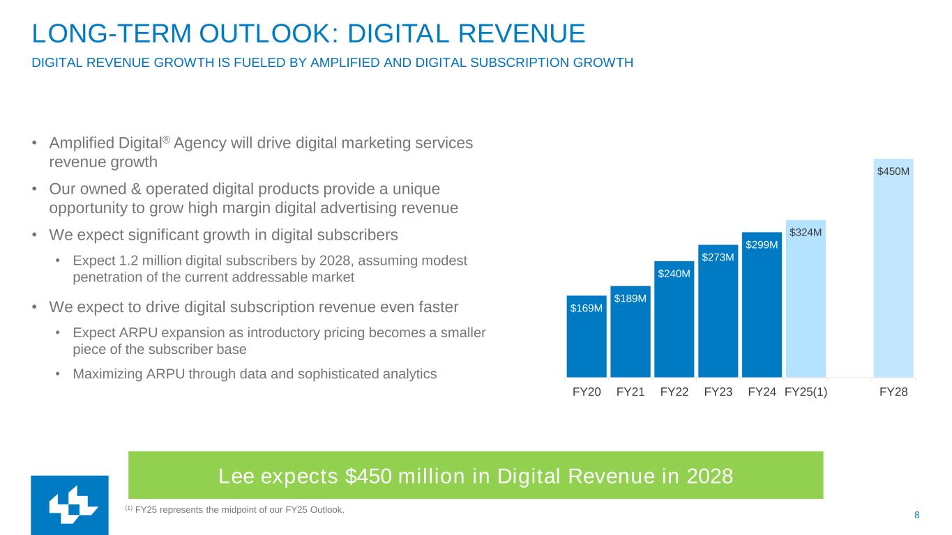 7 FY21 FY22 FY23 FY24 FY25E FY26E FY27E FY28E Digital Margin SG&A Digital transformation Digital sustainability LEE NEARS SUSTAINABILITY FROM DIGITAL REVENUE KEY HIGHLIGHTS • Digital revenue replacing print revenue and growing at 17% CAGR since 2021 • Digital gross margin(1) growing at a 13% CAGR since 2021 • Digital subscription revenue and gross margin growing at a 44% CAGR since 2021 • Amplified Digital® Agency revenue growing at a 34% CAGR since 2021 • Digital gross margin(1) expected to exceed total SG&A costs in FY26 • Digital gross margin(1) remains strong at 72% margin GROSS MARGIN FY24 Total Company Gross Margin (1) Digital Gross Margin is a non-GAAP performance measure calculated by Digital Revenue less Cost of Good Sold (“COGS”) directly tied to digital products. Digital Margin excludes all Selling, General, and Administrative (“SG&A”) costs.