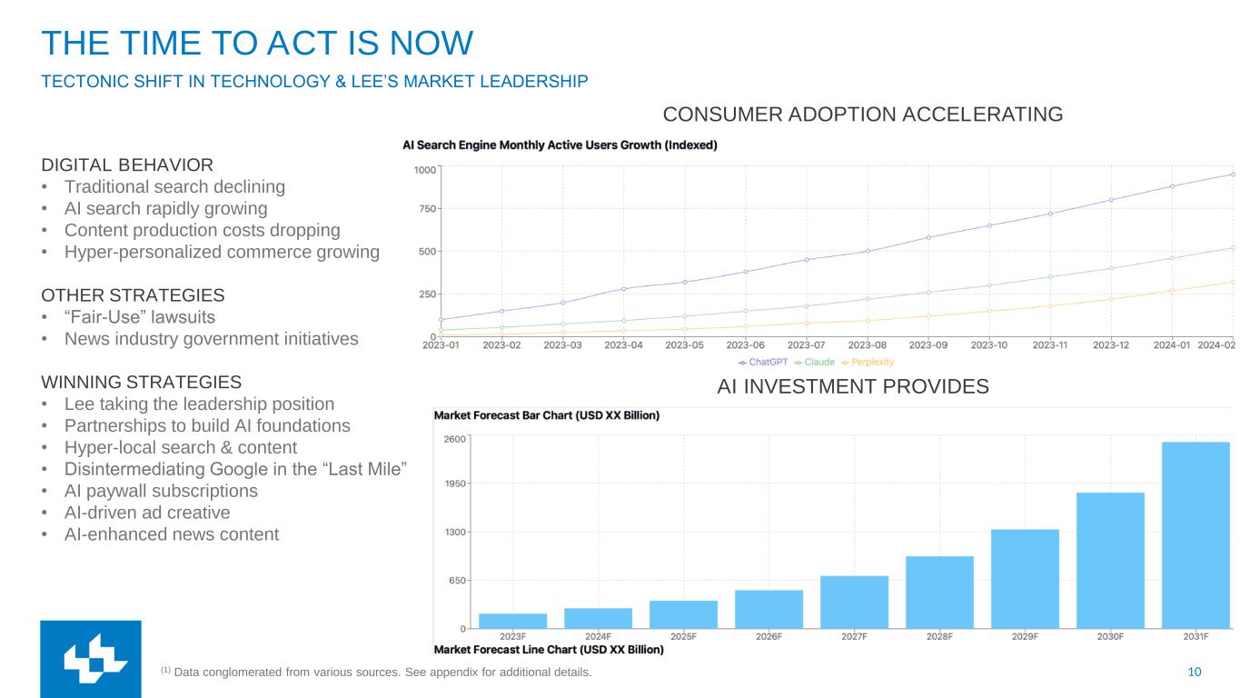 10 THE TIME TO ACT IS NOW TECTONIC SHIFT IN TECHNOLOGY & LEE’S MARKET LEADERSHIP DIGITAL BEHAVIOR • Traditional search declining • AI search rapidly growing • Content production costs dropping • Hyper-personalized commerce growing OTHER STRATEGIES • “Fair-Use” lawsuits • News industry government initiatives WINNING STRATEGIES • Lee taking the leadership position • Partnerships to build AI foundations • Hyper-local search & content • Disintermediating Google in the “Last Mile” • AI paywall subscriptions • AI-driven ad creative • AI-enhanced news content CONSUMER ADOPTION ACCELERATING AI INVESTMENT PROVIDES (1) Data conglomerated from various sources. See appendix for additional details.
