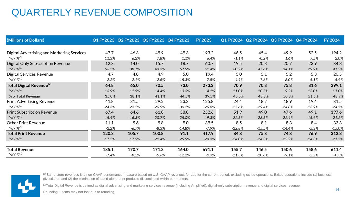 13 NON-GAAP RECONCILIATION The Company uses non-GAAP financial performance measures to supplement the financial information presented on a U.S. GAAP basis. These non-GAAP financial measures, which may not be comparable to similarly titled measures reported by other companies, should not be considered in isolation from or as a substitute for the related U.S. GAAP measures and should be read together with financial information presented on a U.S. GAAP basis. The Company defines its non-GAAP measures as follows: Adjusted EBITDA is a non-GAAP financial performance measure that enhances financial statement users overall understanding of the operating performance of the Company. The measure isolates unusual, infrequent or non-cash transactions from the operating performance of the business. This allows users to easily compare operating performance among various fiscal periods and how management measures the performance of the business. This measure also provides users with a benchmark that can be used when forecasting future operating performance of the Company that excludes unusual, nonrecurring or one-time transactions. Adjusted EBITDA is a component of the calculation used by stockholders and analysts to determine the value of our business when using the market approach, which applies a market multiple to financial metrics. It is also a measure used to calculate the leverage ratio of the Company, which is a key financial ratio monitored and used by the Company and its investors. Adjusted EBITDA is defined as net income (loss), plus non-operating expenses, income tax expense, depreciation and amortization, assets loss (gain) on sales, impairments and other, restructuring costs and other, stock compensation and our 50% share of EBITDA from TNI and MNI, minus equity in earnings of TNI and MNI. Cash Costs represent a non-GAAP financial performance measure of operating expenses which are measured on an accrual basis and settled in cash. This measure is useful to investors in understanding the components of the Company’s cash-settled operating costs. Periodically, the Company provides forward-looking guidance of Cash Costs, which can be used by financial statement users to assess the Company's ability to manage and control its operating cost structure. Cash Costs are defined as compensation, newsprint and ink and other operating expenses. Depreciation and amortization, assets loss (gain) on sales, impairments and other, other non-cash operating expenses and other expenses are excluded. Cash Costs also exclude restructuring costs and other, which are typically paid in cash. Same-store revenues is a non-GAAP performance measure based on U.S. GAAP revenues for Lee for the current period, excluding exited operations. Exited operations include (1) business divestitures and (2) the elimination of stand-alone print products discontinued within our markets. Gross Margin is a non-GAAP financial performance measure that enhances financial statement users overall understanding of the operating performance of the Company. The measure isolates operating costs that directly support revenue. Depreciation and amortization, assets loss (gain) on sales, impairments and other, net, other non-cash operating expenses, Selling, General, and Administrative (“SG&A”) compensation and SG&A other operating expenses are excluded from Gross Margin. TNI and MNI – TNI refers to TNI Partners publishing operations in Tucson, AZ. MNI refers to Madison Newspapers, Inc. publishing operations in Madison, WI. Management’s Use of Non-GAAP Measures These Non-GAAP Measures are not measurements of financial performance under U.S. GAAP and should not be considered in isolation or as an alternative to income from operations, net income (loss), revenues, or any other measure of performance or liquidity derived in accordance with U.S. GAAP. We believe these non-GAAP financial measures, as we have defined them, are helpful in identifying trends in our day-to-day performance because the items excluded have little or no significance on our day-to-day operations. These measures provide an assessment of controllable expenses and afford management the ability to make decisions which are expected to facilitate meeting current financial goals as well as achieve optimal financial performance. We use these Non-GAAP measures of our day-to-day operating performance, which is evidenced by the publishing and delivery of news and other media and excludes certain expenses that may not be indicative of our day-to-day business operating results. Limitations of Non-GAAP Measures Each of our non-GAAP measures have limitations as analytical tools. They should not be viewed in isolation or as a substitute for U.S. GAAP measures of earnings. Material limitations in making the adjustments to our earnings to calculate Adjusted EBITDA using these non-GAAP financial measures as compared to U.S. GAAP net income (loss) include: the cash portion of interest / financing expense, income tax (benefit) provision, and charges related to asset impairments, which may significantly affect our financial results. Management believes these items are important in evaluating our performance, results of operations, and financial position. We use non-GAAP financial measures to supplement our U.S. GAAP results in order to provide a more complete understanding of the factors and trends affecting our business.
