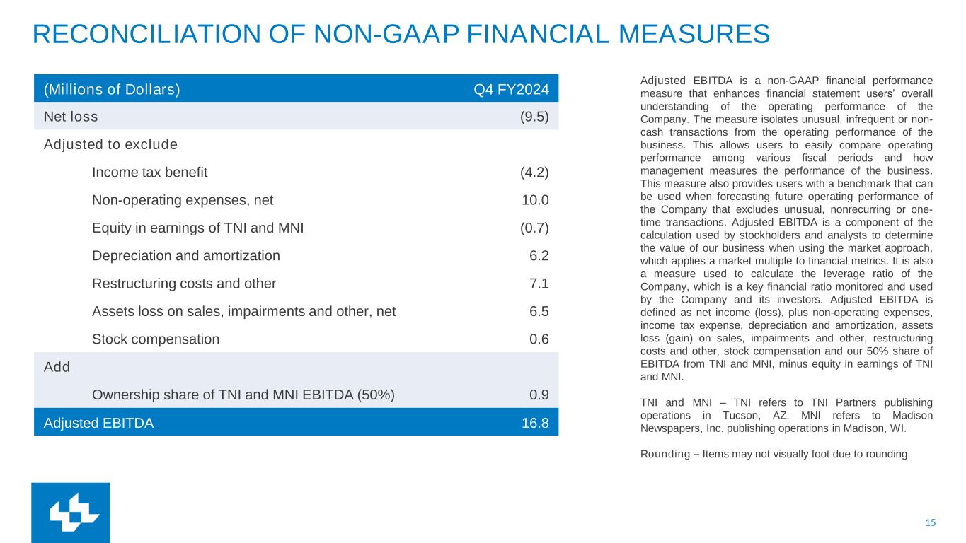 15 RECONCILIATION OF NON-GAAP FINANCIAL MEASURES Adjusted EBITDA is a non-GAAP financial performance measure that enhances financial statement users’ overall understanding of the operating performance of the Company. The measure isolates unusual, infrequent or non- cash transactions from the operating performance of the business. This allows users to easily compare operating performance among various fiscal periods and how management measures the performance of the business. This measure also provides users with a benchmark that can be used when forecasting future operating performance of the Company that excludes unusual, nonrecurring or one- time transactions. Adjusted EBITDA is a component of the calculation used by stockholders and analysts to determine the value of our business when using the market approach, which applies a market multiple to financial metrics. It is also a measure used to calculate the leverage ratio of the Company, which is a key financial ratio monitored and used by the Company and its investors. Adjusted EBITDA is defined as net income (loss), plus non-operating expenses, income tax expense, depreciation and amortization, assets loss (gain) on sales, impairments and other, restructuring costs and other, stock compensation and our 50% share of EBITDA from TNI and MNI, minus equity in earnings of TNI and MNI. TNI and MNI – TNI refers to TNI Partners publishing operations in Tucson, AZ. MNI refers to Madison Newspapers, Inc. publishing operations in Madison, WI. Rounding – Items may not visually foot due to rounding. (Millions of Dollars) Q4 FY2024 Net loss (9.5) Adjusted to exclude Income tax benefit (4.2) Non-operating expenses, net 10.0 Equity in earnings of TNI and MNI (0.7) Depreciation and amortization 6.2 Restructuring costs and other 7.1 Assets loss on sales, impairments and other, net 6.5 Stock compensation 0.6 Add Ownership share of TNI and MNI EBITDA (50%) 0.9 Adjusted EBITDA 16.8