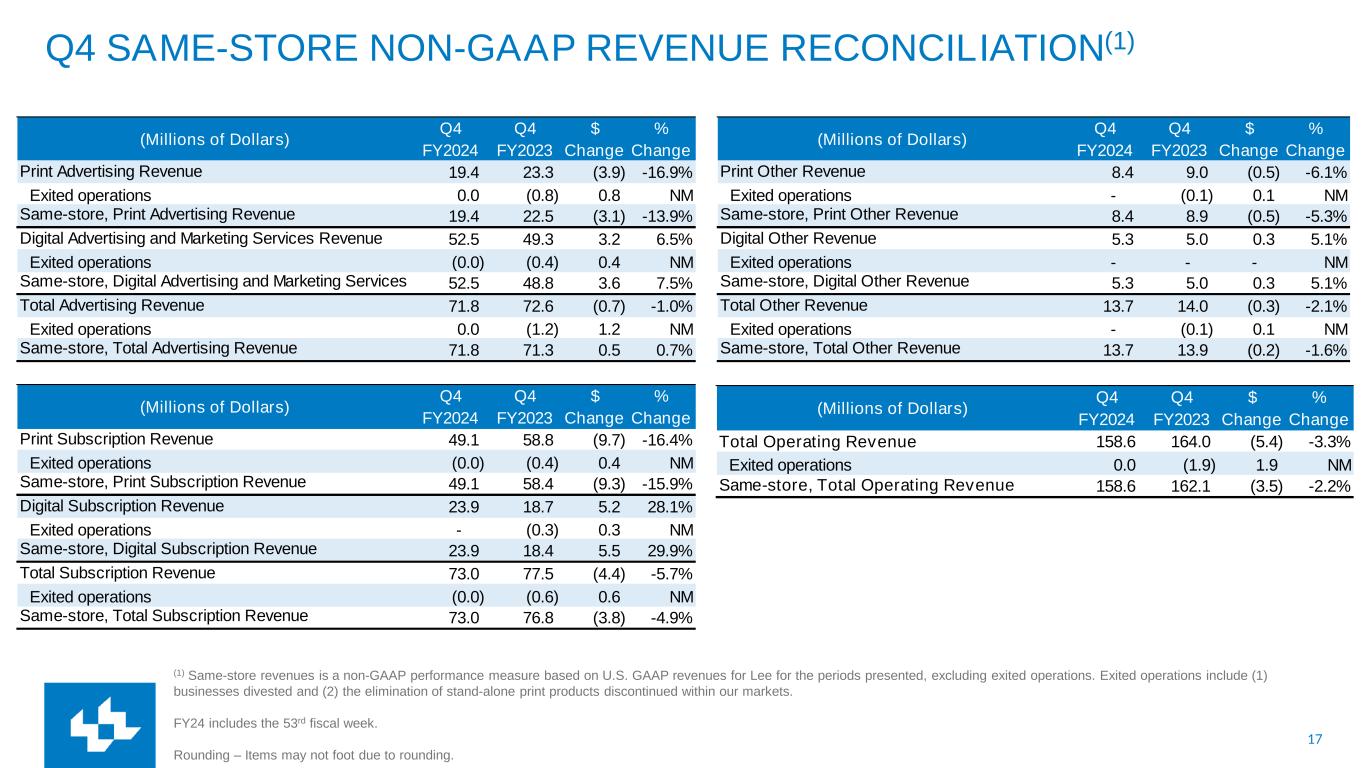16 RECONCILIATION OF NON-GAAP FINANCIAL MEASURES Cash Costs represent a non-GAAP financial performance measure of operating expenses which are measured on an accrual basis and settled in cash. This measure is useful to investors in understanding the components of the Company’s cash-settled operating costs. Periodically, the Company provides forward-looking guidance of Cash Costs, which can be used by financial statement users to assess the Company's ability to manage and control its operating cost structure. Cash Costs are defined as compensation, newsprint and ink and other operating expenses. Depreciation and amortization, assets loss (gain) on sales, impairments and other, other non- cash operating expenses and other expenses are excluded. Cash Costs also exclude restructuring costs and other, which are typically paid in cash. Rounding – Items may not visually foot due to rounding. (Millions of Dollars) Q4 FY2024 Q4 FY2023 Operating Expenses 162.9 156.1 Adjusted to exclude Depreciation and amortization 6.2 7.5 Assets loss on sales, impairments and other, net 6.5 6.1 Restructuring costs and other 7.1 4.6 Cash Costs 143.2 137.9