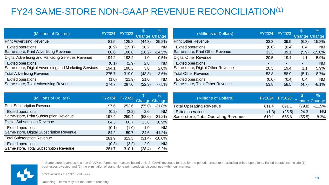 17 Q4 SAME-STORE NON-GAAP REVENUE RECONCILIATION(1) (Millions of Dollars) Q4 FY2024 Q4 FY2023 $ Change % Change Print Other Revenue 8.4 9.0 (0.5) -6.1% Exited operations - (0.1) 0.1 NM Same-store, Print Other Revenue 8.4 8.9 (0.5) -5.3% Digital Other Revenue 5.3 5.0 0.3 5.1% Exited operations - - - NM Same-store, Digital Other Revenue 5.3 5.0 0.3 5.1% Total Other Revenue 13.7 14.0 (0.3) -2.1% Exited operations - (0.1) 0.1 NM Same-store, Total Other Revenue 13.7 13.9 (0.2) -1.6% (Millions of Dollars) Q4 FY2024 Q4 FY2023 $ Change % Change Total Operating Revenue 158.6 164.0 (5.4) -3.3% Exited operations 0.0 (1.9) 1.9 NM Same-store, Total Operating Revenue 158.6 162.1 (3.5) -2.2% (Millions of Dollars) Q4 FY2024 Q4 FY2023 $ Change % Change Print Advertising Revenue 19.4 23.3 (3.9) -16.9% Exited operations 0.0 (0.8) 0.8 NM Same-store, Print Advertising Revenue 19.4 22.5 (3.1) -13.9% Digital Advertising and Marketing Services Revenue 52.5 49.3 3.2 6.5% Exited operations (0.0) (0.4) 0.4 NM Same-store, Digital Advertising and Marketing Services 52.5 48.8 3.6 7.5% Total Advertising Revenue 71.8 72.6 (0.7) -1.0% Exited operations 0.0 (1.2) 1.2 NM Same-store, Total Advertising Revenue 71.8 71.3 0.5 0.7% (Millions of Dollars) Q4 FY2024 Q4 FY2023 $ Change % Change Print Subscription Revenue 49.1 58.8 (9.7) -16.4% Exited operations (0.0) (0.4) 0.4 NM Same-store, Print Subscription Revenue 49.1 58.4 (9.3) -15.9% Digital Subscription Revenue 23.9 18.7 5.2 28.1% Exited operations - (0.3) 0.3 NM Same-store, Digital Subscription Revenue 23.9 18.4 5.5 29.9% Total Subscription Revenue 73.0 77.5 (4.4) -5.7% Exited operations (0.0) (0.6) 0.6 NM Same-store, Total Subscription Revenue 73.0 76.8 (3.8) -4.9% (1) Same-store revenues is a non-GAAP performance measure based on U.S. GAAP revenues for Lee for the periods presented, excluding exited operations. Exited operations include (1) businesses divested and (2) the elimination of stand-alone print products discontinued within our markets. FY24 includes the 53rd fiscal week. Rounding – Items may not foot due to rounding.