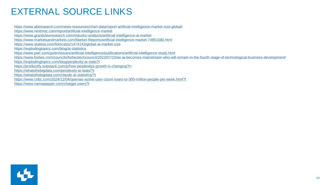 19 EXTERNAL SOURCE LINKS https://www.abiresearch.com/news-resources/chart-data/report-artificial-intelligence-market-size-global/ https://www.nextmsc.com/report/artificial-intelligence-market https://www.grandviewresearch.com/industry-analysis/artificial-intelligence-ai-market https://www.marketsandmarkets.com/Market-Reports/artificial-intelligence-market-74851580.html https://www.statista.com/forecasts/1474143/global-ai-market-size https://explodingtopics.com/blog/ai-statistics https://www.pwc.com/gx/en/issues/artificial-intelligence/publications/artificial-intelligence-study.html https://www.forbes.com/councils/forbestechcouncil/2023/07/10/as-ai-becomes-mainstream-who-will-remain-in-the-fourth-stage-of-technological-business-development/ https://explodingtopics.com/blog/perplexity-ai-stats?t https://productify.substack.com/p/how-perplexitys-growth-is-changing?t= https://whatsthebigdata.com/perplexity-ai-stats/?t https://whatsthebigdata.com/claude-ai-statistics/?t https://www.cnbc.com/2024/12/04/openais-active-user-count-soars-to-300-million-people-per-week.html?t https://www.namepepper.com/chatgpt-users?t