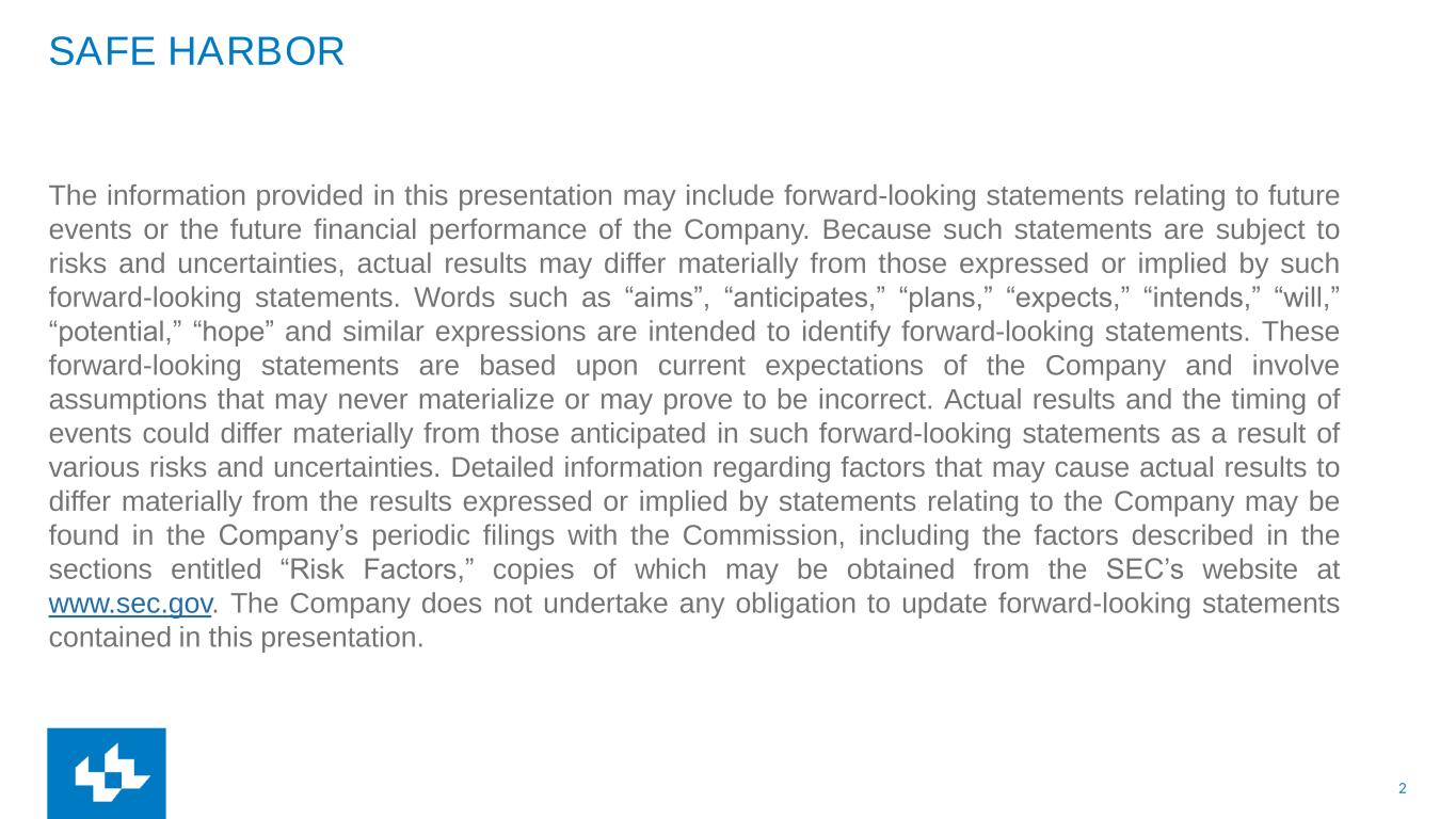 2 SAFE HARBOR The information provided in this presentation may include forward-looking statements relating to future events or the future financial performance of the Company. Because such statements are subject to risks and uncertainties, actual results may differ materially from those expressed or implied by such forward-looking statements. Words such as “aims”, “anticipates,” “plans,” “expects,” “intends,” “will,” “potential,” “hope” and similar expressions are intended to identify forward-looking statements. These forward-looking statements are based upon current expectations of the Company and involve assumptions that may never materialize or may prove to be incorrect. Actual results and the timing of events could differ materially from those anticipated in such forward-looking statements as a result of various risks and uncertainties. Detailed information regarding factors that may cause actual results to differ materially from the results expressed or implied by statements relating to the Company may be found in the Company’s periodic filings with the Commission, including the factors described in the sections entitled “Risk Factors,” copies of which may be obtained from the SEC’s website at www.sec.gov. The Company does not undertake any obligation to update forward-looking statements contained in this presentation.
