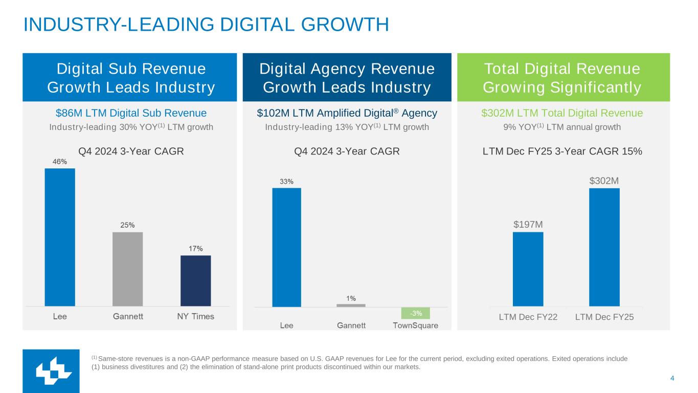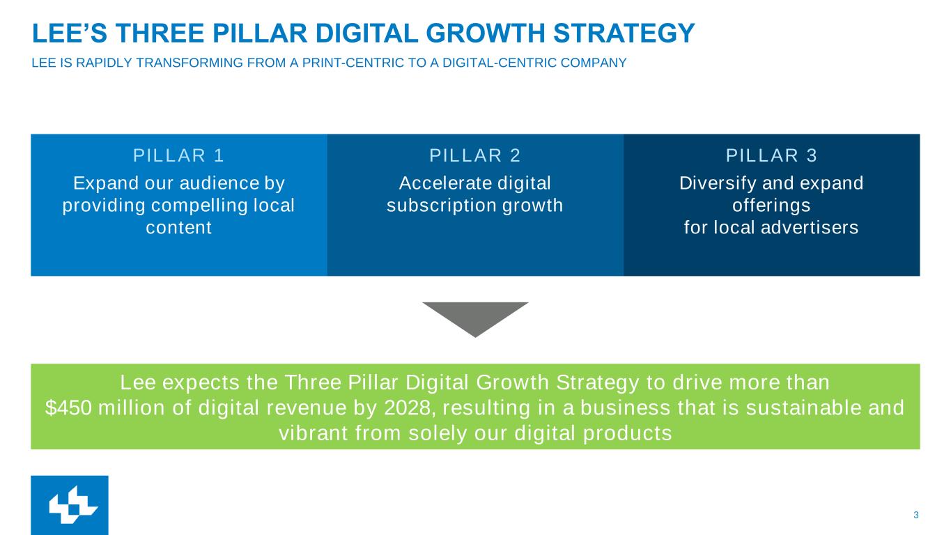 3 LEE’S THREE PILLAR DIGITAL GROWTH STRATEGY LEE IS RAPIDLY TRANSFORMING FROM A PRINT-CENTRIC TO A DIGITAL-CENTRIC COMPANY PILLAR 1 Expand our audience by providing compelling local content PILLAR 2 Accelerate digital subscription growth PILLAR 3 Diversify and expand offerings for local advertisers Lee expects the Three Pillar Digital Growth Strategy to drive more than $450 million of digital revenue by 2028, resulting in a business that is sustainable and vibrant from solely our digital products