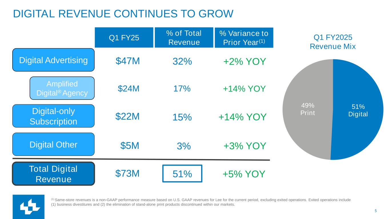 4 Digital Sub Revenue Growth Leads Industry Digital Agency Revenue Growth Leads Industry Total Digital Revenue Growing Significantly $86M LTM Digital Sub Revenue $102M LTM Amplified Digital® Agency $302M LTM Total Digital Revenue Industry-leading 30% YOY(1) LTM growth Q4 2024 3-Year CAGR Industry-leading 13% YOY(1) LTM growth Q4 2024 3-Year CAGR 9% YOY(1) LTM annual growth LTM Dec FY25 3-Year CAGR 15% INDUSTRY-LEADING DIGITAL GROWTH LTM Dec FY22 LTM Dec FY25 (1) Same-store revenues is a non-GAAP performance measure based on U.S. GAAP revenues for Lee for the current period, excluding exited operations. Exited operations include (1) business divestitures and (2) the elimination of stand-alone print products discontinued within our markets. $302M $197M