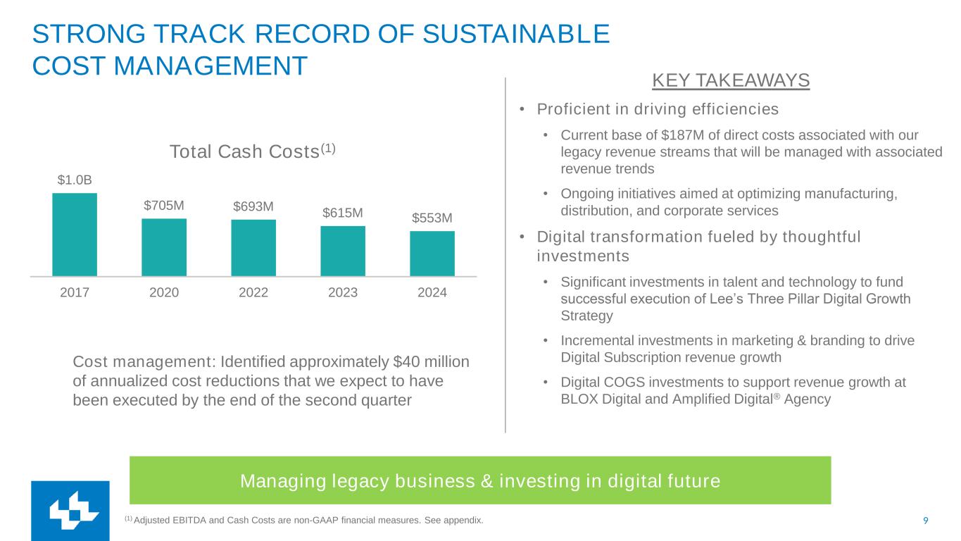 8 FIRST QUARTER 2025 RESULTS (1) Same-store revenues is a non-GAAP performance measure based on U.S. GAAP revenues for Lee for the current period, excluding exited operations. Exited operations include (1) business divestitures and (2) the elimination of stand-alone print products discontinued within our markets. (2) Adjusted EBITDA and Cash Costs are non-GAAP financial measures. See appendix. Q1 Revenue Total Digital Revenue $73M, +5% YOY on a Same-store basis(1) • Digital subscription revenue $22M, +14%(1) • Digital advertising revenue $47M, +2%(1) • Amplified Digital® revenue $24M, +14%(1) Total Print Revenue $71M, -15%(1) Total Operating Revenue $145M, -6%(1) Q1 Cash Costs(2) • Total Cash Costs $139M, -1% YOY Q1 Adjusted EBITDA(2) • Adjusted EBITDA $8M Continued digital revenue growth Strong cost control of legacy business Investments to drive digital transformation