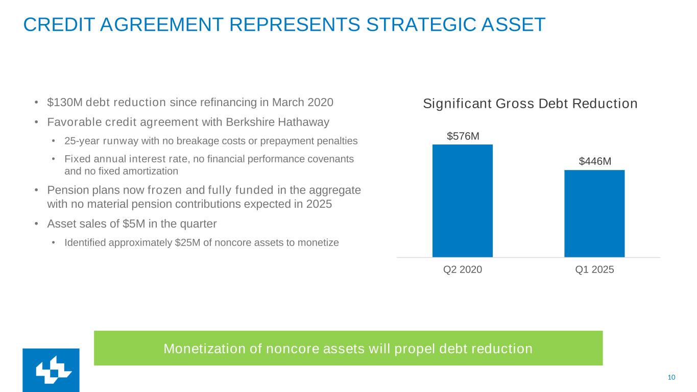 10 Q2 2020 Q1 2025 CREDIT AGREEMENT REPRESENTS STRATEGIC ASSET • $130M debt reduction since refinancing in March 2020 • Favorable credit agreement with Berkshire Hathaway • 25-year runway with no breakage costs or prepayment penalties • Fixed annual interest rate, no financial performance covenants and no fixed amortization • Pension plans now frozen and fully funded in the aggregate with no material pension contributions expected in 2025 • Asset sales of $5M in the quarter • Identified approximately $25M of noncore assets to monetize Monetization of noncore assets will propel debt reduction $576M $446M Significant Gross Debt Reduction