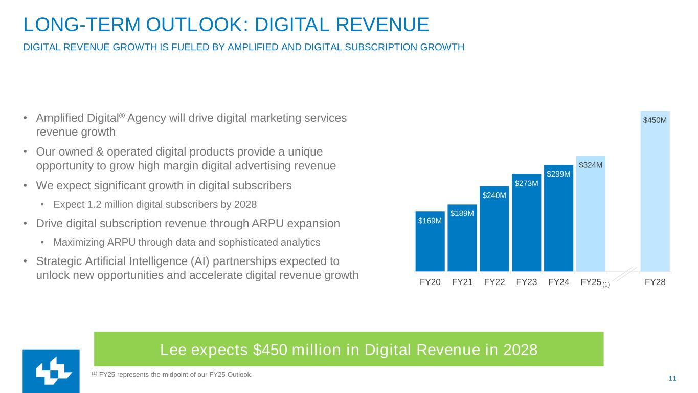 11 DIGITAL REVENUE GROWTH IS FUELED BY AMPLIFIED AND DIGITAL SUBSCRIPTION GROWTH • Amplified Digital® Agency will drive digital marketing services revenue growth • Our owned & operated digital products provide a unique opportunity to grow high margin digital advertising revenue • We expect significant growth in digital subscribers • Expect 1.2 million digital subscribers by 2028 • Drive digital subscription revenue through ARPU expansion • Maximizing ARPU through data and sophisticated analytics • Strategic Artificial Intelligence (AI) partnerships expected to unlock new opportunities and accelerate digital revenue growth $169M $189M $240M $273M $299M $324M $450M $M $100M $200M $300M $400M $500M FY20 FY21 FY22 FY23 FY24 FY25 FY28 LONG-TERM OUTLOOK: DIGITAL REVENUE Lee expects $450 million in Digital Revenue in 2028 (1) FY25 represents the midpoint of our FY25 Outlook. (1)