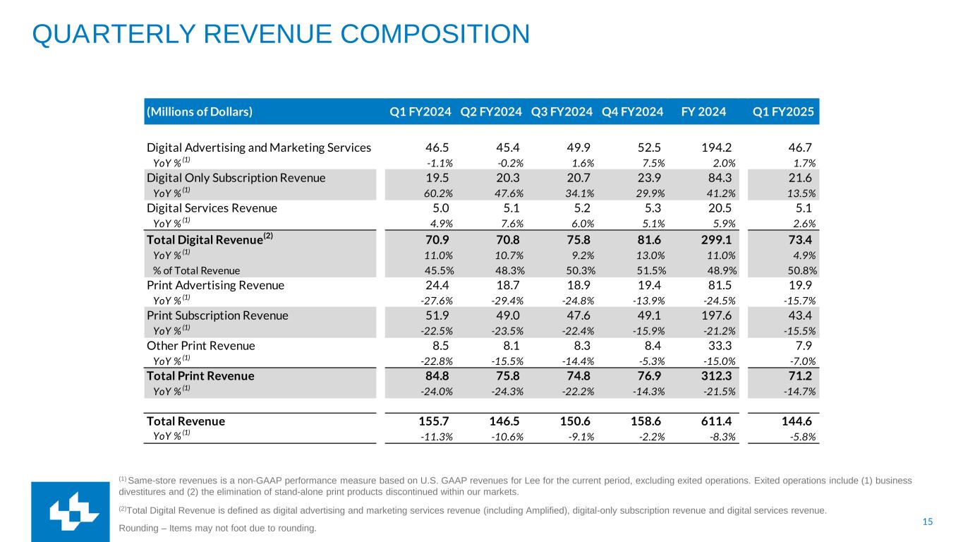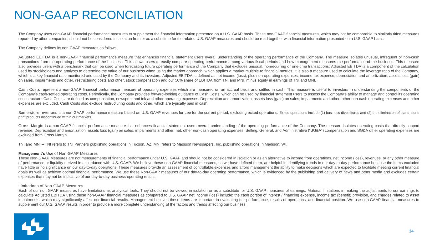 14 NON-GAAP RECONCILIATION The Company uses non-GAAP financial performance measures to supplement the financial information presented on a U.S. GAAP basis. These non-GAAP financial measures, which may not be comparable to similarly titled measures reported by other companies, should not be considered in isolation from or as a substitute for the related U.S. GAAP measures and should be read together with financial information presented on a U.S. GAAP basis. The Company defines its non-GAAP measures as follows: Adjusted EBITDA is a non-GAAP financial performance measure that enhances financial statement users overall understanding of the operating performance of the Company. The measure isolates unusual, infrequent or non-cash transactions from the operating performance of the business. This allows users to easily compare operating performance among various fiscal periods and how management measures the performance of the business. This measure also provides users with a benchmark that can be used when forecasting future operating performance of the Company that excludes unusual, nonrecurring or one-time transactions. Adjusted EBITDA is a component of the calculation used by stockholders and analysts to determine the value of our business when using the market approach, which applies a market multiple to financial metrics. It is also a measure used to calculate the leverage ratio of the Company, which is a key financial ratio monitored and used by the Company and its investors. Adjusted EBITDA is defined as net income (loss), plus non-operating expenses, income tax expense, depreciation and amortization, assets loss (gain) on sales, impairments and other, restructuring costs and other, stock compensation and our 50% share of EBITDA from TNI and MNI, minus equity in earnings of TNI and MNI. Cash Costs represent a non-GAAP financial performance measure of operating expenses which are measured on an accrual basis and settled in cash. This measure is useful to investors in understanding the components of the Company’s cash-settled operating costs. Periodically, the Company provides forward-looking guidance of Cash Costs, which can be used by financial statement users to assess the Company's ability to manage and control its operating cost structure. Cash Costs are defined as compensation, newsprint and ink and other operating expenses. Depreciation and amortization, assets loss (gain) on sales, impairments and other, other non-cash operating expenses and other expenses are excluded. Cash Costs also exclude restructuring costs and other, which are typically paid in cash. Same-store revenues is a non-GAAP performance measure based on U.S. GAAP revenues for Lee for the current period, excluding exited operations. Exited operations include (1) business divestitures and (2) the elimination of stand-alone print products discontinued within our markets. Gross Margin is a non-GAAP financial performance measure that enhances financial statement users overall understanding of the operating performance of the Company. The measure isolates operating costs that directly support revenue. Depreciation and amortization, assets loss (gain) on sales, impairments and other, net, other non-cash operating expenses, Selling, General, and Administrative (“SG&A”) compensation and SG&A other operating expenses are excluded from Gross Margin. TNI and MNI – TNI refers to TNI Partners publishing operations in Tucson, AZ. MNI refers to Madison Newspapers, Inc. publishing operations in Madison, WI. Management’s Use of Non-GAAP Measures These Non-GAAP Measures are not measurements of financial performance under U.S. GAAP and should not be considered in isolation or as an alternative to income from operations, net income (loss), revenues, or any other measure of performance or liquidity derived in accordance with U.S. GAAP. We believe these non-GAAP financial measures, as we have defined them, are helpful in identifying trends in our day-to-day performance because the items excluded have little or no significance on our day-to-day operations. These measures provide an assessment of controllable expenses and afford management the ability to make decisions which are expected to facilitate meeting current financial goals as well as achieve optimal financial performance. We use these Non-GAAP measures of our day-to-day operating performance, which is evidenced by the publishing and delivery of news and other media and excludes certain expenses that may not be indicative of our day-to-day business operating results. Limitations of Non-GAAP Measures Each of our non-GAAP measures have limitations as analytical tools. They should not be viewed in isolation or as a substitute for U.S. GAAP measures of earnings. Material limitations in making the adjustments to our earnings to calculate Adjusted EBITDA using these non-GAAP financial measures as compared to U.S. GAAP net income (loss) include: the cash portion of interest / financing expense, income tax (benefit) provision, and charges related to asset impairments, which may significantly affect our financial results. Management believes these items are important in evaluating our performance, results of operations, and financial position. We use non-GAAP financial measures to supplement our U.S. GAAP results in order to provide a more complete understanding of the factors and trends affecting our business.