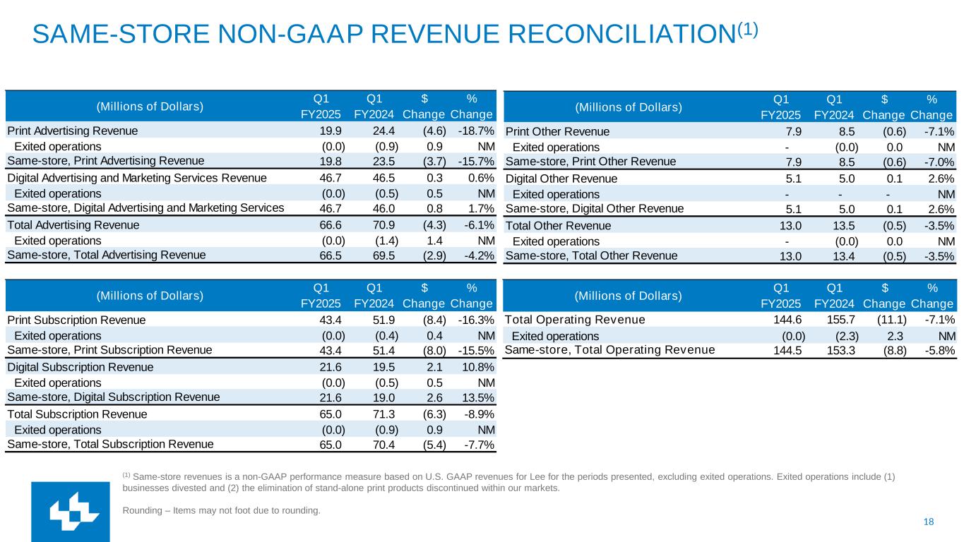 17 RECONCILIATION OF NON-GAAP FINANCIAL MEASURES Cash Costs represent a non-GAAP financial performance measure of operating expenses which are measured on an accrual basis and settled in cash. This measure is useful to investors in understanding the components of the Company’s cash-settled operating costs. Periodically, the Company provides forward-looking guidance of Cash Costs, which can be used by financial statement users to assess the Company's ability to manage and control its operating cost structure. Cash Costs are defined as compensation, newsprint and ink and other operating expenses. Depreciation and amortization, assets loss (gain) on sales, impairments and other, other non- cash operating expenses and other expenses are excluded. Cash Costs also exclude restructuring costs and other, which are typically paid in cash. Rounding – Items may not visually foot due to rounding. (Millions of Dollars) Q1 FY2025 Q1 FY2024 Operating Expenses 149.0 149.4 Adjusted to exclude Depreciation and amortization 6.3 7.3 Assets gain on sales, impairments and other, net (0.9) (1.5) Restructuring costs and other 5.1 4.3 Cash Costs 138.6 139.3