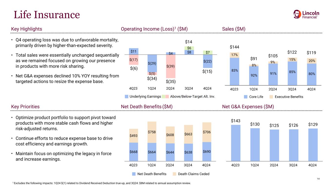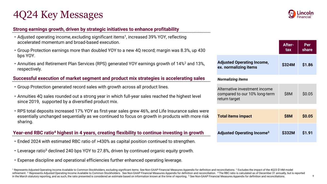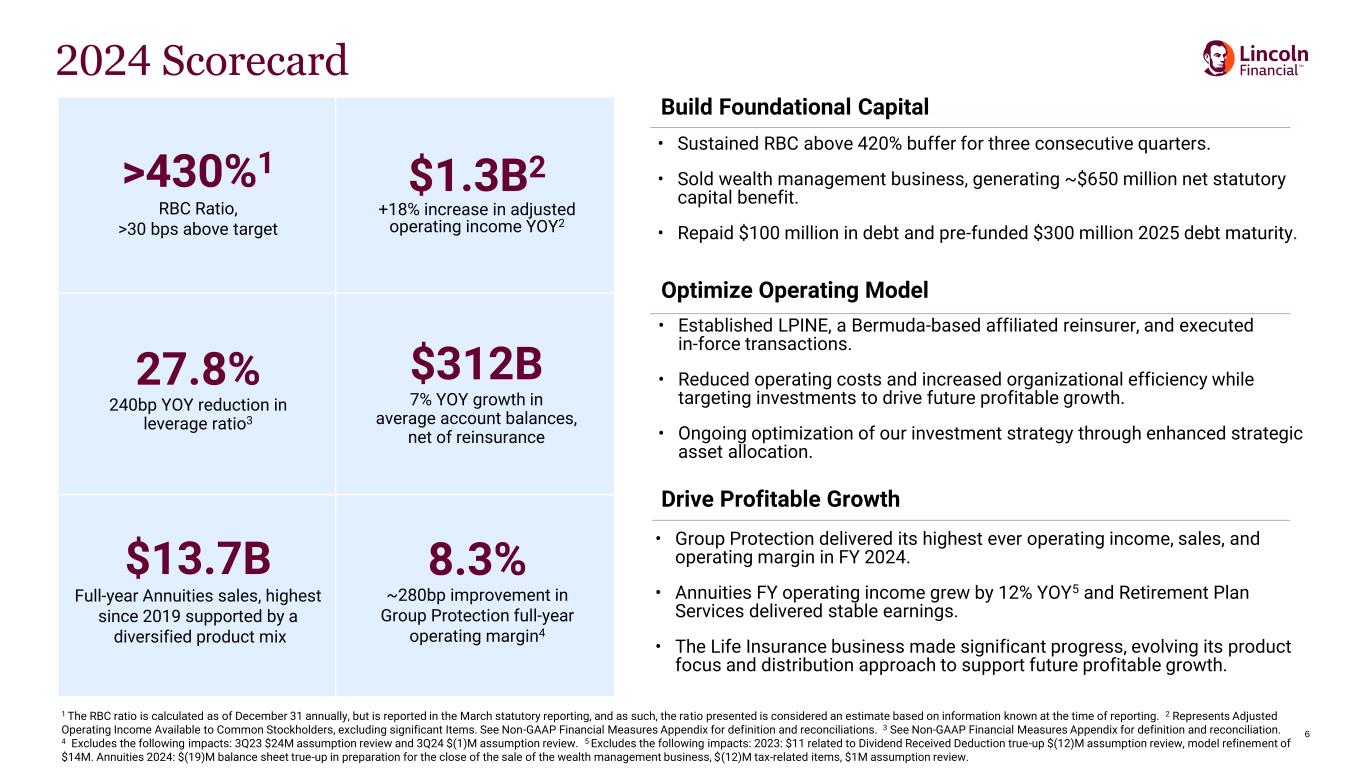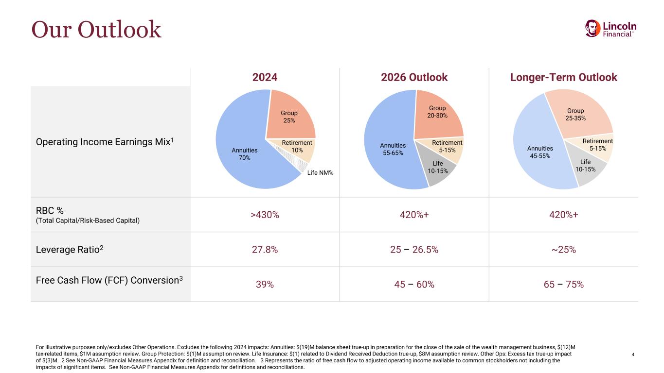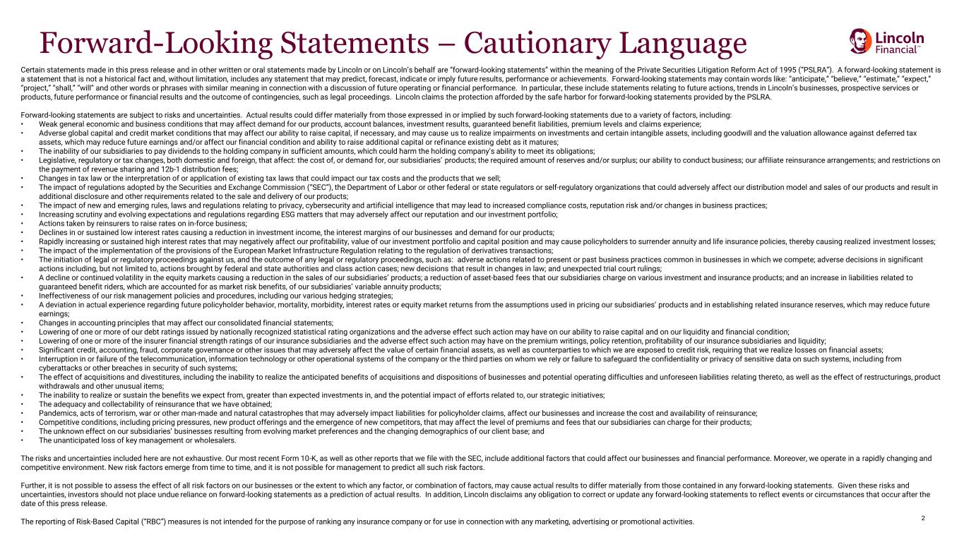 2 Forward-Looking Statements – Cautionary Language Certain statements made in this press release and in other written or oral statements made by Lincoln or on Lincoln’s behalf are “forward-looking statements” within the meaning of the Private Securities Litigation Reform Act of 1995 (“PSLRA”). A forward-looking statement is a statement that is not a historical fact and, without limitation, includes any statement that may predict, forecast, indicate or imply future results, performance or achievements. Forward-looking statements may contain words like: “anticipate,” “believe,” “estimate,” “expect,” “project,” “shall,” “will” and other words or phrases with similar meaning in connection with a discussion of future operating or financial performance. In particular, these include statements relating to future actions, trends in Lincoln’s businesses, prospective services or products, future performance or financial results and the outcome of contingencies, such as legal proceedings. Lincoln claims the protection afforded by the safe harbor for forward-looking statements provided by the PSLRA. Forward-looking statements are subject to risks and uncertainties. Actual results could differ materially from those expressed in or implied by such forward-looking statements due to a variety of factors, including: • Weak general economic and business conditions that may affect demand for our products, account balances, investment results, guaranteed benefit liabilities, premium levels and claims experience; • Adverse global capital and credit market conditions that may affect our ability to raise capital, if necessary, and may cause us to realize impairments on investments and certain intangible assets, including goodwill and the valuation allowance against deferred tax assets, which may reduce future earnings and/or affect our financial condition and ability to raise additional capital or refinance existing debt as it matures; • The inability of our subsidiaries to pay dividends to the holding company in sufficient amounts, which could harm the holding company’s ability to meet its obligations; • Legislative, regulatory or tax changes, both domestic and foreign, that affect: the cost of, or demand for, our subsidiaries’ products; the required amount of reserves and/or surplus; our ability to conduct business; our affiliate reinsurance arrangements; and restrictions on the payment of revenue sharing and 12b-1 distribution fees; • Changes in tax law or the interpretation of or application of existing tax laws that could impact our tax costs and the products that we sell; • The impact of regulations adopted by the Securities and Exchange Commission (“SEC”), the Department of Labor or other federal or state regulators or self-regulatory organizations that could adversely affect our distribution model and sales of our products and result in additional disclosure and other requirements related to the sale and delivery of our products; • The impact of new and emerging rules, laws and regulations relating to privacy, cybersecurity and artificial intelligence that may lead to increased compliance costs, reputation risk and/or changes in business practices; • Increasing scrutiny and evolving expectations and regulations regarding ESG matters that may adversely affect our reputation and our investment portfolio; • Actions taken by reinsurers to raise rates on in-force business; • Declines in or sustained low interest rates causing a reduction in investment income, the interest margins of our businesses and demand for our products; • Rapidly increasing or sustained high interest rates that may negatively affect our profitability, value of our investment portfolio and capital position and may cause policyholders to surrender annuity and life insurance policies, thereby causing realized investment losses; • The impact of the implementation of the provisions of the European Market Infrastructure Regulation relating to the regulation of derivatives transactions; • The initiation of legal or regulatory proceedings against us, and the outcome of any legal or regulatory proceedings, such as: adverse actions related to present or past business practices common in businesses in which we compete; adverse decisions in significant actions including, but not limited to, actions brought by federal and state authorities and class action cases; new decisions that result in changes in law; and unexpected trial court rulings; • A decline or continued volatility in the equity markets causing a reduction in the sales of our subsidiaries’ products; a reduction of asset-based fees that our subsidiaries charge on various investment and insurance products; and an increase in liabilities related to guaranteed benefit riders, which are accounted for as market risk benefits, of our subsidiaries’ variable annuity products; • Ineffectiveness of our risk management policies and procedures, including our various hedging strategies; • A deviation in actual experience regarding future policyholder behavior, mortality, morbidity, interest rates or equity market returns from the assumptions used in pricing our subsidiaries’ products and in establishing related insurance reserves, which may reduce future earnings; • Changes in accounting principles that may affect our consolidated financial statements; • Lowering of one or more of our debt ratings issued by nationally recognized statistical rating organizations and the adverse effect such action may have on our ability to raise capital and on our liquidity and financial condition; • Lowering of one or more of the insurer financial strength ratings of our insurance subsidiaries and the adverse effect such action may have on the premium writings, policy retention, profitability of our insurance subsidiaries and liquidity; • Significant credit, accounting, fraud, corporate governance or other issues that ma