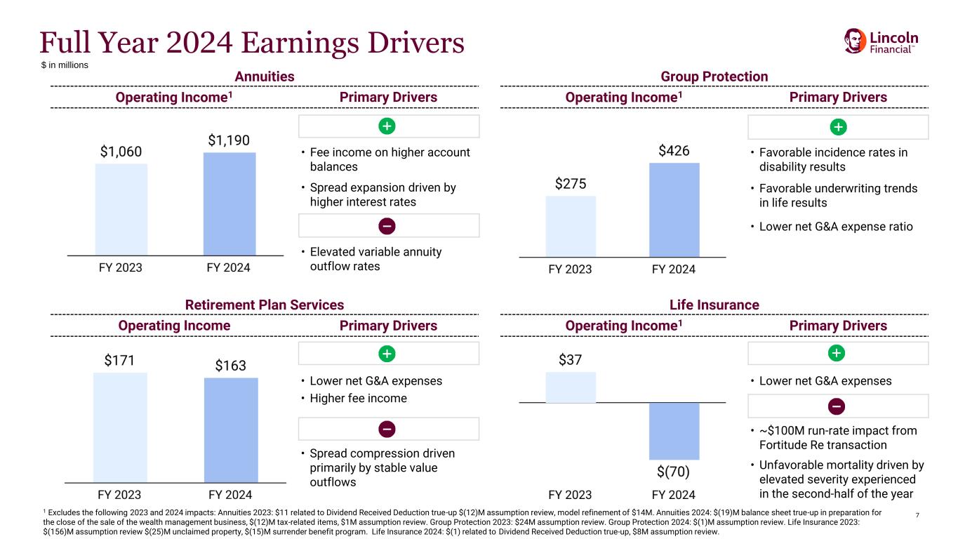 6 1 The RBC ratio is calculated as of December 31 annually, but is reported in the March statutory reporting, and as such, the ratio presented is considered an estimate based on information known at the time of reporting. 2 Represents Adjusted Operating Income Available to Common Stockholders, excluding significant Items. See Non-GAAP Financial Measures Appendix for definition and reconciliations. 3 See Non-GAAP Financial Measures Appendix for definition and reconciliation. 4 Excludes the following impacts: 3Q23 $24M assumption review and 3Q24 $(1)M assumption review. 5 Excludes the following impacts: 2023: $11 related to Dividend Received Deduction true-up $(12)M assumption review, model refinement of $14M. Annuities 2024: $(19)M balance sheet true-up in preparation for the close of the sale of the wealth management business, $(12)M tax-related items, $1M assumption review. 2024 Scorecard 27.8% 240bp YOY reduction in leverage ratio3 8.3% ~280bp improvement in Group Protection full-year operating margin4 $312B 7% YOY growth in average account balances, net of reinsurance $1.3B2 +18% increase in adjusted operating income YOY2 >430%1 RBC Ratio, >30 bps above target $13.7B Full-year Annuities sales, highest since 2019 supported by a diversified product mix Build Foundational Capital • Sustained RBC above 420% buffer for three consecutive quarters. • Sold wealth management business, generating ~$650 million net statutory capital benefit. • Repaid $100 million in debt and pre-funded $300 million 2025 debt maturity. Optimize Operating Model • Established LPINE, a Bermuda-based affiliated reinsurer, and executed in-force transactions. • Reduced operating costs and increased organizational efficiency while targeting investments to drive future profitable growth. • Ongoing optimization of our investment strategy through enhanced strategic asset allocation. Drive Profitable Growth • Group Protection delivered its highest ever operating income, sales, and operating margin in FY 2024. • Annuities FY operating income grew by 12% YOY5 and Retirement Plan Services delivered stable earnings. • The Life Insurance business made significant progress, evolving its product focus and distribution approach to support future profitable growth.