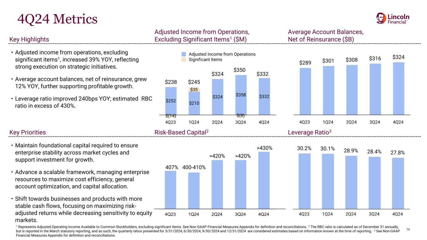 9 Strong earnings growth, driven by strategic initiatives to enhance profitability • Adjusted operating income, excluding significant items1, increased 39% YOY, reflecting accelerated momentum and broad-based execution. • Group Protection earnings more than doubled YOY to a new 4Q record; margin was 8.3%, up 430 bps YOY. • Annuities and Retirement Plan Services (RPS) generated YOY earnings growth of 14%2 and 13%, respectively. Successful execution of market segment and product mix strategies is accelerating sales • Group Protection generated record sales with growth across all product lines. • Annuities 4Q sales rounded out a strong year in which full-year sales reached the highest level since 2019, supported by a diversified product mix. • RPS total deposits increased 17% YOY as first-year sales grew 46%, and Life Insurance sales were essentially unchanged sequentially as we continued to focus on growth in products with more risk sharing. Year-end RBC ratio4 highest in 4 years, creating flexibility to continue investing in growth • Ended 2024 with estimated RBC ratio of >430% as capital position continued to strengthen. • Leverage ratio5 declined 240 bps YOY to 27.8%, driven by continued organic equity growth. • Expense discipline and operational efficiencies further enhanced operating leverage. After- tax Per share Adjusted Operating Income, ex. normalizing items $324M $1.86 Normalizing items Alternative investment income compared to our 10% long-term return target $8M $0.05 Total items impact $8M $0.05 Adjusted Operating Income3 $332M $1.91 4Q24 Key Messages 1 Represents Adjusted Operating Income Available to Common Stockholders, excluding significant items. See Non-GAAP Financial Measures Appendix for definition and reconciliations. 2 Excludes the impact of the 4Q23 $14M model refinement. 3 Represents Adjusted Operating Income Available to Common Stockholders. See Non-GAAP Financial Measures Appendix for definition and reconciliation. 4 The RBC ratio is calculated as of December 31 annually, but is reported in the March statutory reporting, and as such, the ratio presented is considered an estimate based on information known at the time of reporting. 5 See Non-GAAP Financial Measures Appendix for definition and reconciliations.