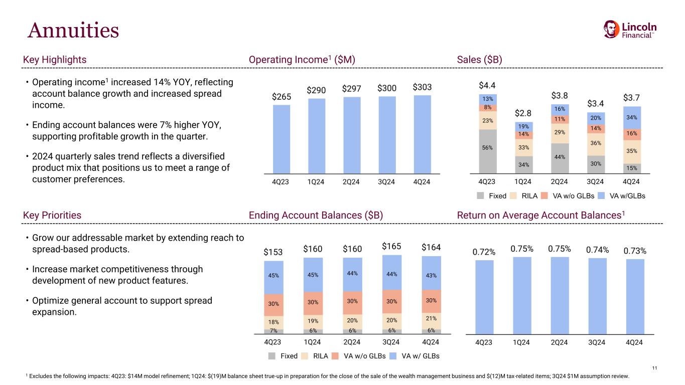 10 Key Highlights Adjusted Income from Operations, Excluding Significant Items1 ($M) Average Account Balances, Net of Reinsurance ($B) • Adjusted income from operations, excluding significant items1, increased 39% YOY, reflecting strong execution on strategic initiatives. • Average account balances, net of reinsurance, grew 12% YOY, further supporting profitable growth. • Leverage ratio improved 240bps YOY; estimated RBC ratio in excess of 430%. Key Priorities Risk-Based Capital2 Leverage Ratio3 • Maintain foundational capital required to ensure enterprise stability across market cycles and support investment for growth. • Advance a scalable framework, managing enterprise resources to maximize cost efficiency, general account optimization, and capital allocation. • Shift towards businesses and products with more stable cash flows, focusing on maximizing risk- adjusted returns while decreasing sensitivity to equity markets. 4Q24 Metrics $238 $245 $324 $350 407% 400-410% >420% >420% $332 >430% 1 Represents Adjusted Operating Income Available to Common Stockholders, excluding significant Items. See Non-GAAP Financial Measures Appendix for definition and reconciliations. 2 The RBC ratio is calculated as of December 31 annually, but is reported in the March statutory reporting, and as such, the quarterly ratios presented for 3/31/2024, 6/30/2024, 9/30/2024 and 12/31/2024 are considered estimates based on information known at the time of reporting. 3 See Non-GAAP Financial Measures Appendix for definition and reconciliations.