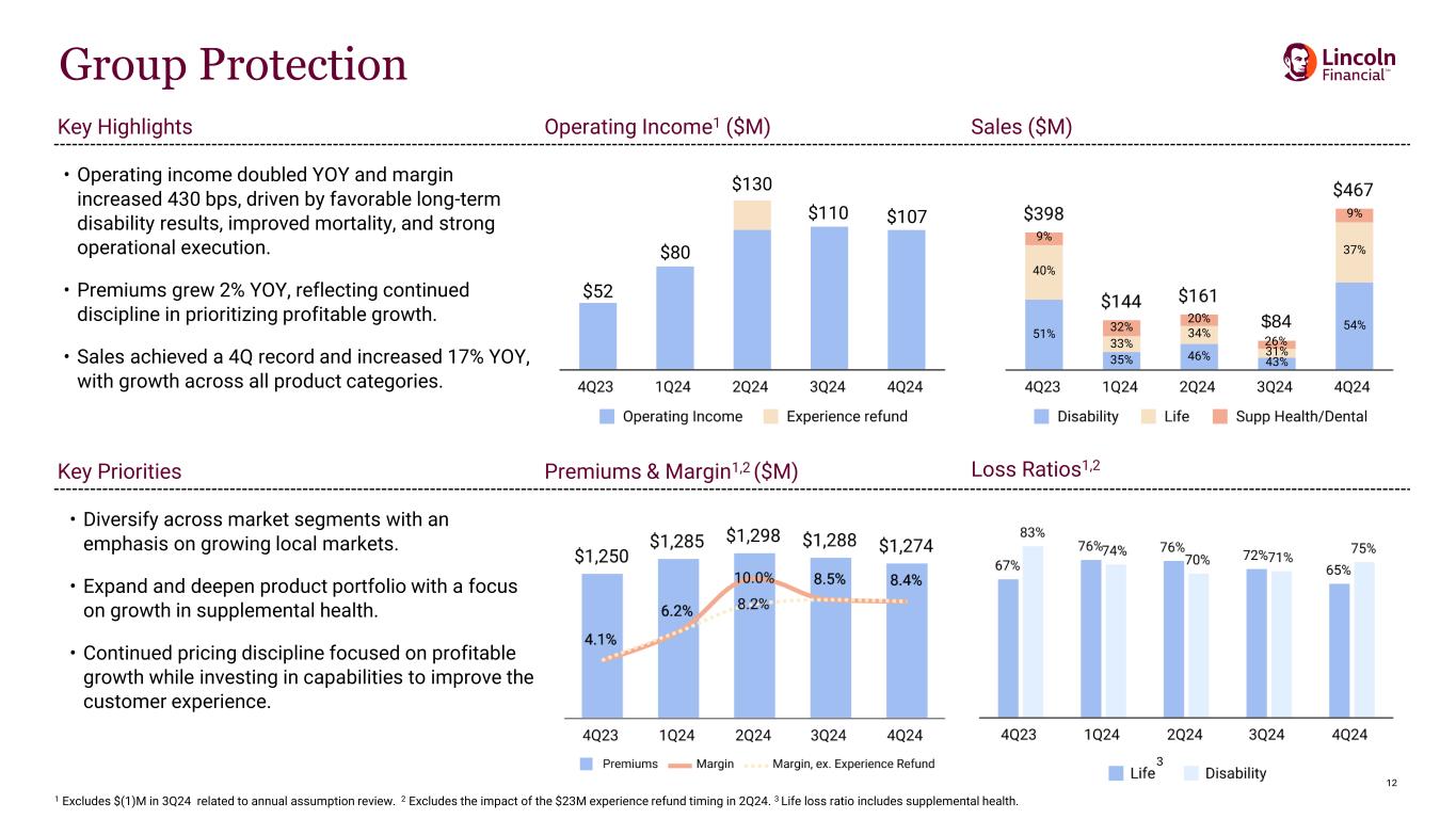 11 Key Highlights Operating Income1 ($M) Sales ($B) • Operating income1 increased 14% YOY, reflecting account balance growth and increased spread income. • Ending account balances were 7% higher YOY, supporting profitable growth in the quarter. • 2024 quarterly sales trend reflects a diversified product mix that positions us to meet a range of customer preferences. Key Priorities Ending Account Balances ($B) Return on Average Account Balances1 • Grow our addressable market by extending reach to spread-based products. • Increase market competitiveness through development of new product features. • Optimize general account to support spread expansion. Annuities 1 Excludes the following impacts: 4Q23: $14M model refinement; 1Q24: $(19)M balance sheet true-up in preparation for the close of the sale of the wealth management business and $(12)M tax-related items; 3Q24 $1M assumption review. 13% 8% 23% 56% 19% 14% 33% 34% 16% 11% 29% 44% 20% 14% 36% 30% 45% 30% 18% 7% 43% 30% 21% 6% 15% 35% 16% 34% 45% 30% 19% 6% 44% 30% 20% 6% 44% 30% 20% 6%