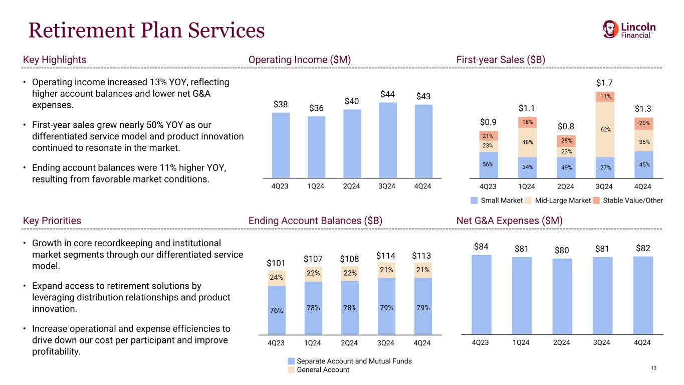 12 Key Highlights Operating Income1 ($M) Sales ($M) • Operating income doubled YOY and margin increased 430 bps, driven by favorable long-term disability results, improved mortality, and strong operational execution. • Premiums grew 2% YOY, reflecting continued discipline in prioritizing profitable growth. • Sales achieved a 4Q record and increased 17% YOY, with growth across all product categories. Key Priorities Premiums & Margin1,2 ($M) Loss Ratios1,2 • Diversify across market segments with an emphasis on growing local markets. • Expand and deepen product portfolio with a focus on growth in supplemental health. • Continued pricing discipline focused on profitable growth while investing in capabilities to improve the customer experience. Group Protection 1 Excludes $(1)M in 3Q24 related to annual assumption review. 2 Excludes the impact of the $23M experience refund timing in 2Q24. 3 Life loss ratio includes supplemental health. 40% 51% 9% 33% 32% 35% 20% 34% 46% 31% 9% 43% 37% 54% $52 $80 $130 $110 $107 3 $84 26%