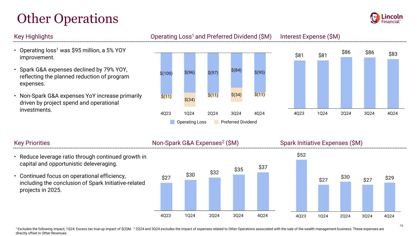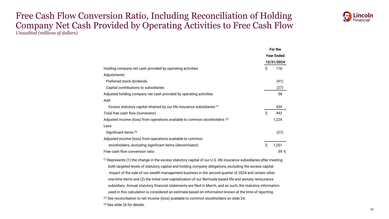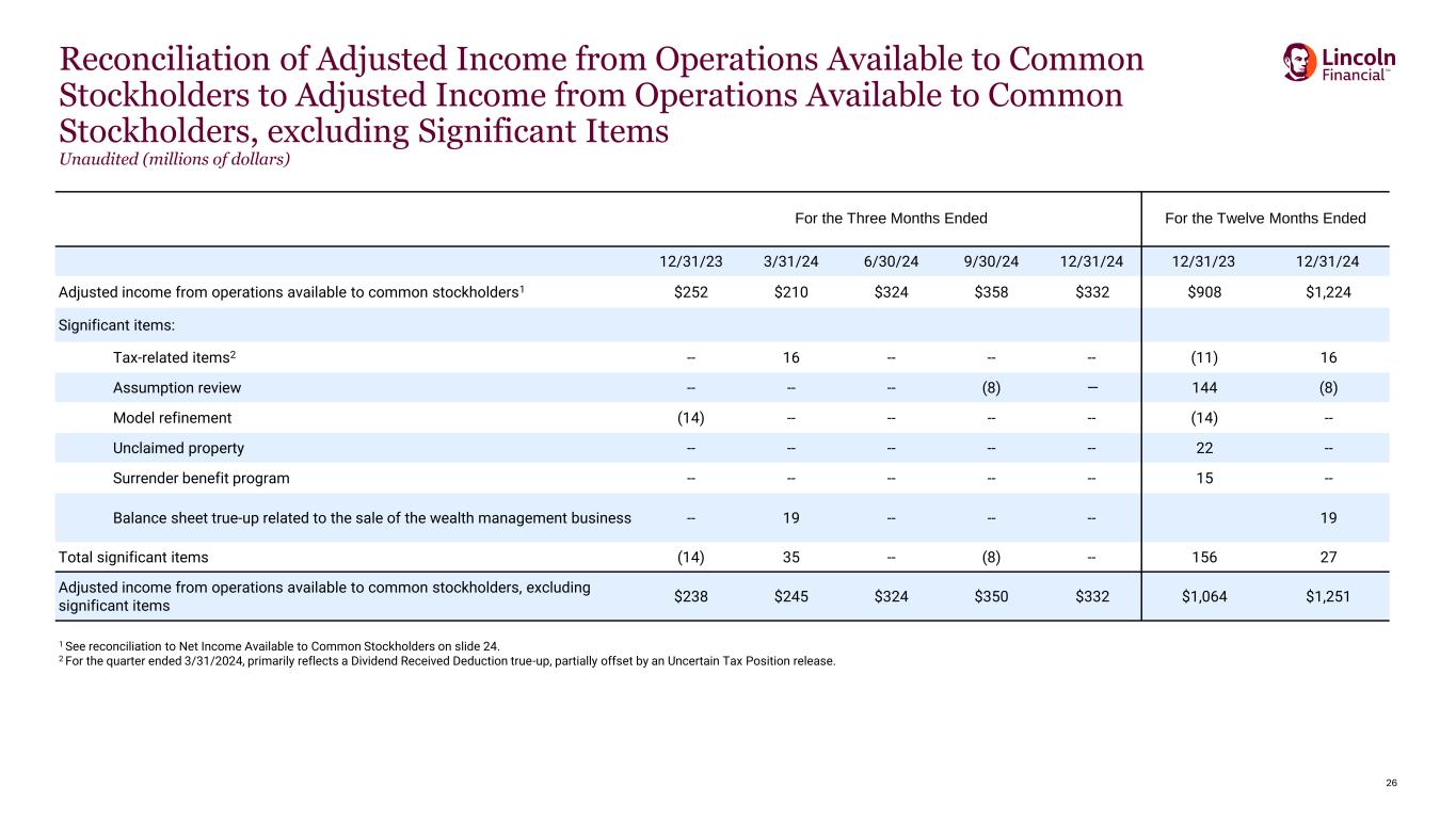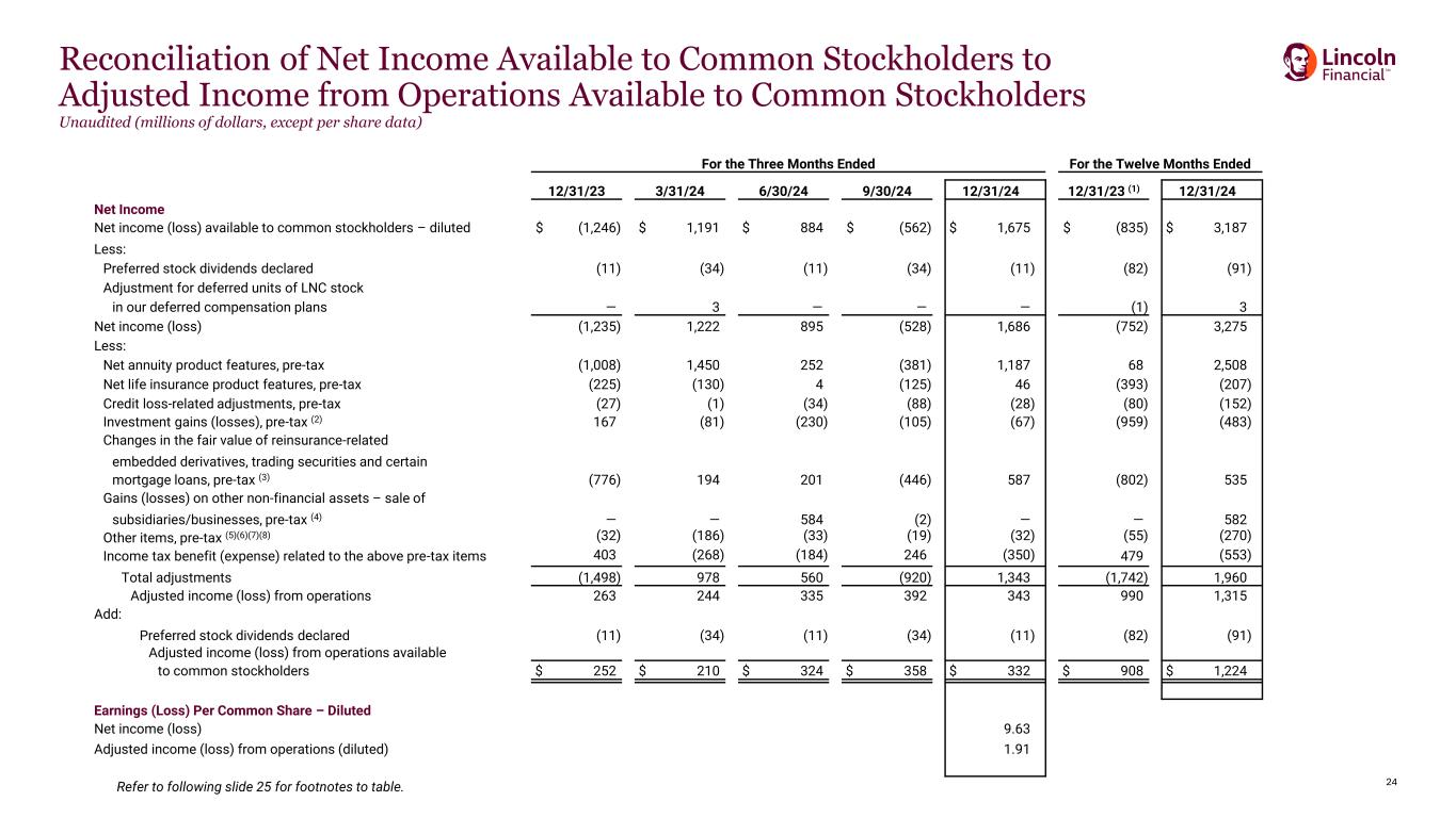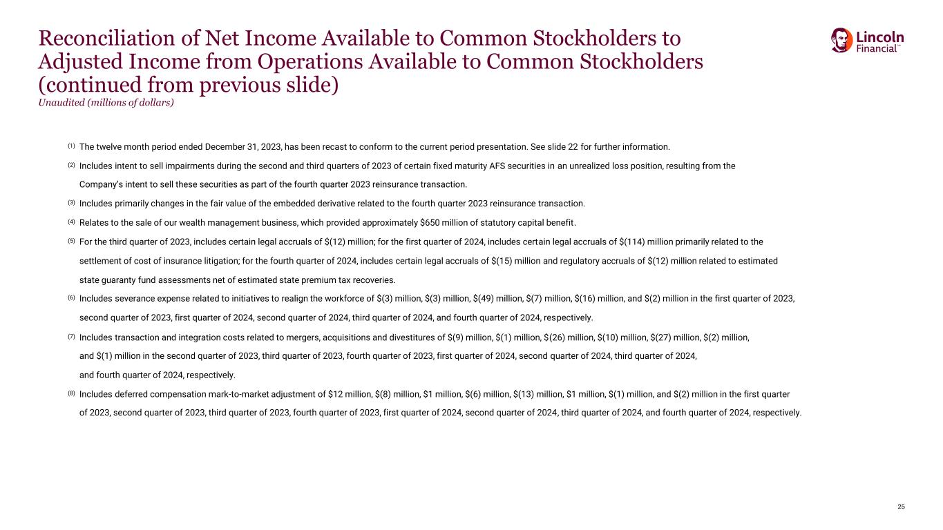 24 Reconciliation of Net Income Available to Common Stockholders to Adjusted Income from Operations Available to Common Stockholders Unaudited (millions of dollars, except per share data) For the Three Months Ended For the Twelve Months Ended 12/31/23 3/31/24 6/30/24 9/30/24 12/31/24 12/31/23 (1) 12/31/24 Net Income Net income (loss) available to common stockholders – diluted $ (1,246) $ 1,191 $ 884 $ (562) $ 1,675 $ (835) $ 3,187 Less: Preferred stock dividends declared (11) (34) (11) (34) (11) (82) (91) Adjustment for deferred units of LNC stock in our deferred compensation plans — 3 — — — (1) 3 Net income (loss) (1,235) 1,222 895 (528) 1,686 (752) 3,275 Less: Net annuity product features, pre-tax (1,008) 1,450 252 (381) 1,187 68 2,508 Net life insurance product features, pre-tax (225) (130) 4 (125) 46 (393) (207) Credit loss-related adjustments, pre-tax (27) (1) (34) (88) (28) (80) (152) Investment gains (losses), pre-tax (2) 167 (81) (230) (105) (67) (959) (483) Changes in the fair value of reinsurance-related embedded derivatives, trading securities and certain mortgage loans, pre-tax (3) (776) 194 201 (446) 587 (802) 535 Gains (losses) on other non-financial assets – sale of subsidiaries/businesses, pre-tax (4) — — 584 (2) — — 582 Other items, pre-tax (5)(6)(7)(8) (32) (186) (33) (19) (32) (55) (270) Income tax benefit (expense) related to the above pre-tax items 403 (268) (184) 246 (350) 479 (553) Total adjustments (1,498) 978 560 (920) 1,343 (1,742) 1,960 Adjusted income (loss) from operations 263 244 335 392 343 990 1,315 Add: Preferred stock dividends declared (11) (34) (11) (34) (11) (82) (91) Adjusted income (loss) from operations available to common stockholders $ 252 $ 210 $ 324 $ 358 $ 332 $ 908 $ 1,224 Earnings (Loss) Per Common Share – Diluted Net income (loss) 9.63 Adjusted income (loss) from operations (diluted) 1.91 Refer to following slide 25 for footnotes to table.