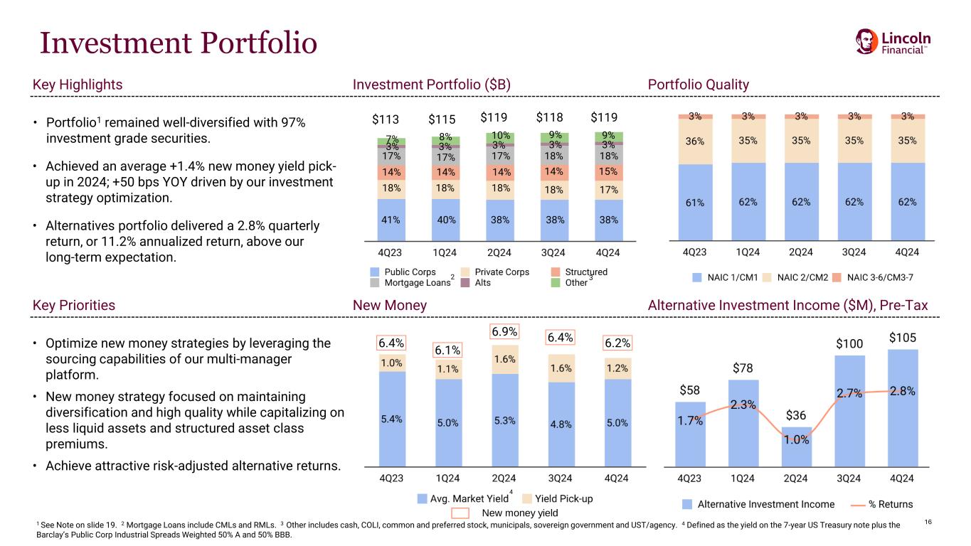 19 Investment Portfolio High quality and well-diversified portfolio1 The portfolio remains well-positioned • Long-term investment strategy is tightly aligned with our liability profile and positioned for various economic cycles. • 97% investment grade, the portfolio quality has increased, providing flexibility to further add incremental yield. • Well positioned to further optimize the portfolio asset allocation given high-quality asset mix and shift towards shorter duration liabilities. Portfolio allocation by asset class 1 Data on slide is as of December 31, 2024. 2 Other asset classes primarily include quasi-sovereign, cash/collateral, and UST/agency. Note: All information regarding LNC’s investment portfolio in this earnings supplement excludes assets related to certain modified coinsurance and coinsurance with funds withheld transactions. The modified coinsurance and funds withheld reinsurance agreements investment portfolio has counterparty protections in place including investment guidelines, as well as additional support including trusts and letters of credit that were established to meet LNC’s risk management objectives. $119B Average A Rated