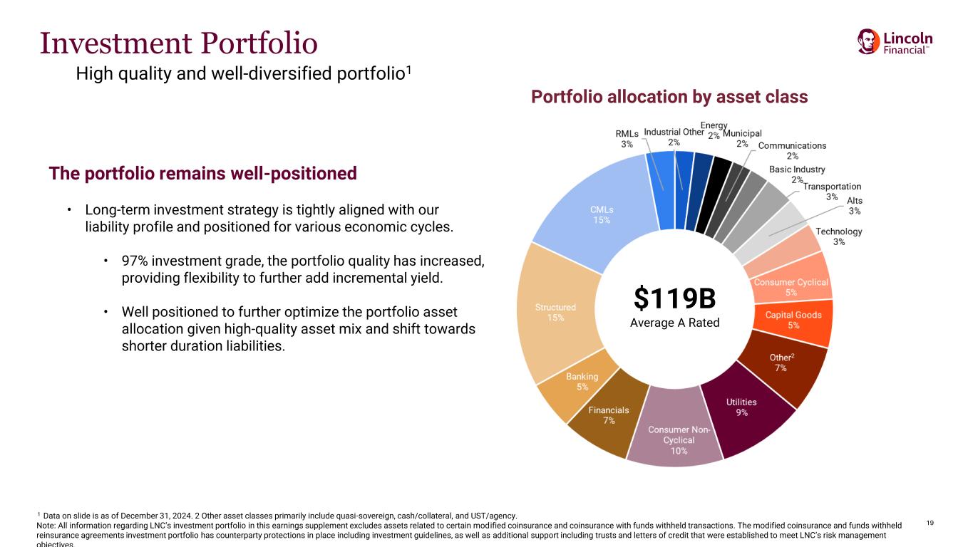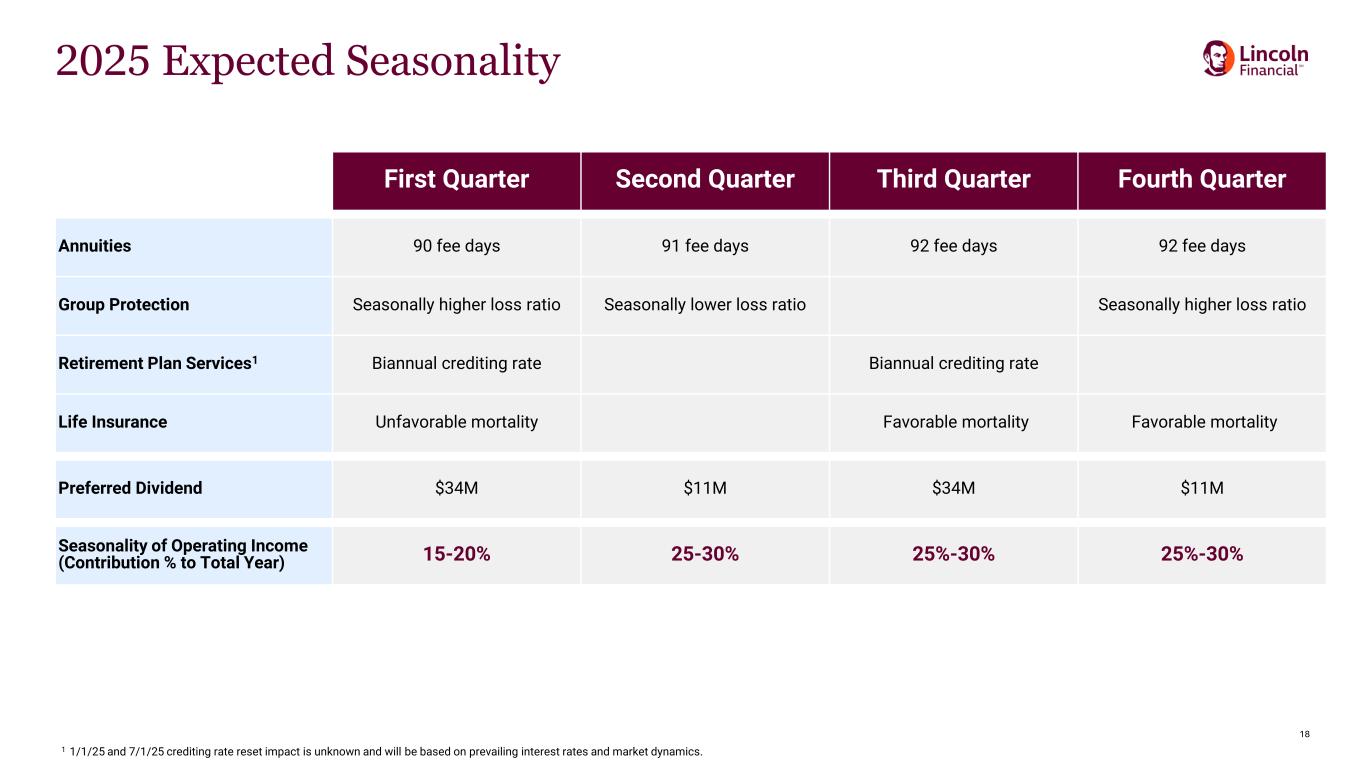18 First Quarter Second Quarter Third Quarter Fourth Quarter Annuities 90 fee days 91 fee days 92 fee days 92 fee days Group Protection Seasonally higher loss ratio Seasonally lower loss ratio Seasonally higher loss ratio Retirement Plan Services1 Biannual crediting rate Biannual crediting rate Life Insurance Unfavorable mortality Favorable mortality Favorable mortality Preferred Dividend $34M $11M $34M $11M Seasonality of Operating Income (Contribution % to Total Year) 15-20% 25-30% 25%-30% 25%-30% 1 1/1/25 and 7/1/25 crediting rate reset impact is unknown and will be based on prevailing interest rates and market dynamics. 2025 Expected Seasonality